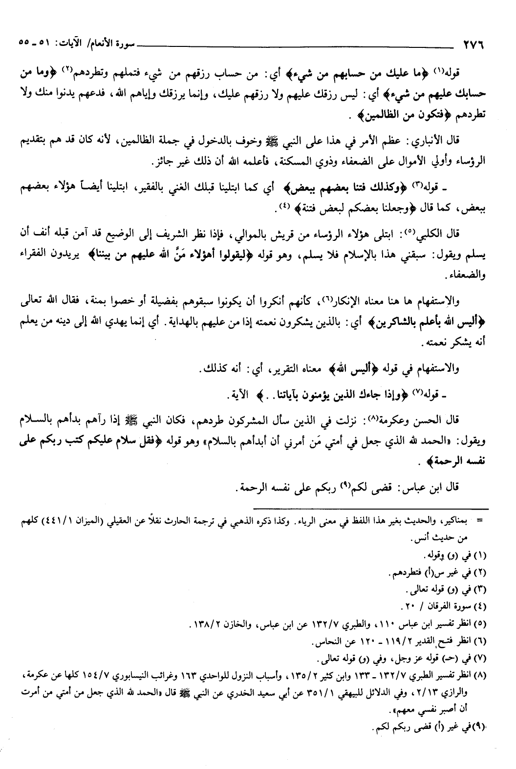 قال الحسن، وعكرمة: نزلت في الذين سأل المشركون طردهم، فكان النبي صَلَّى اللهُ عَلَيْهِ وَسَلَّمَ إذا رآهم بدأهم بالسلام، ويقول: «الحمد لله الذي جعل في أمتي من أمرني أن أبدأهم بالسلام» .