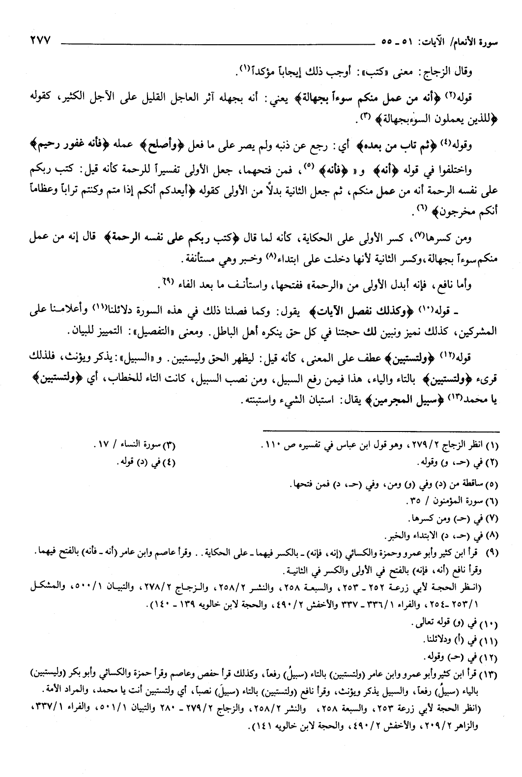 وقوله: {ثُمَّ تَابَ مِنْ بَعْدِهِ} [الأنعام: 54] أي: رجع عن ذنبه ولم يصر على ما فعل، وأصلح: عمله، {فَأَنَّهُ غَفُورٌ رَحِيمٌ} [الأنعام: 54] ، واختلفوا في قوله: أنه وفأنه: فمن فتحهما جعل الأولى تفسيرا للرحمة، كأنه قيل: كتب ربكم على نفسه الرحمة: أنه من عمل منكم، ثم جعل الثانية بدلا من الأولي كقوله: {أَيَعِدُكُمْ أَنَّكُمْ إِذَا مِتُّمْ وَكُنْتُمْ تُرَابًا وَعِظَامًا أَنَّكُمْ مُخْرَجُونَ} [المؤمنون: 35] .