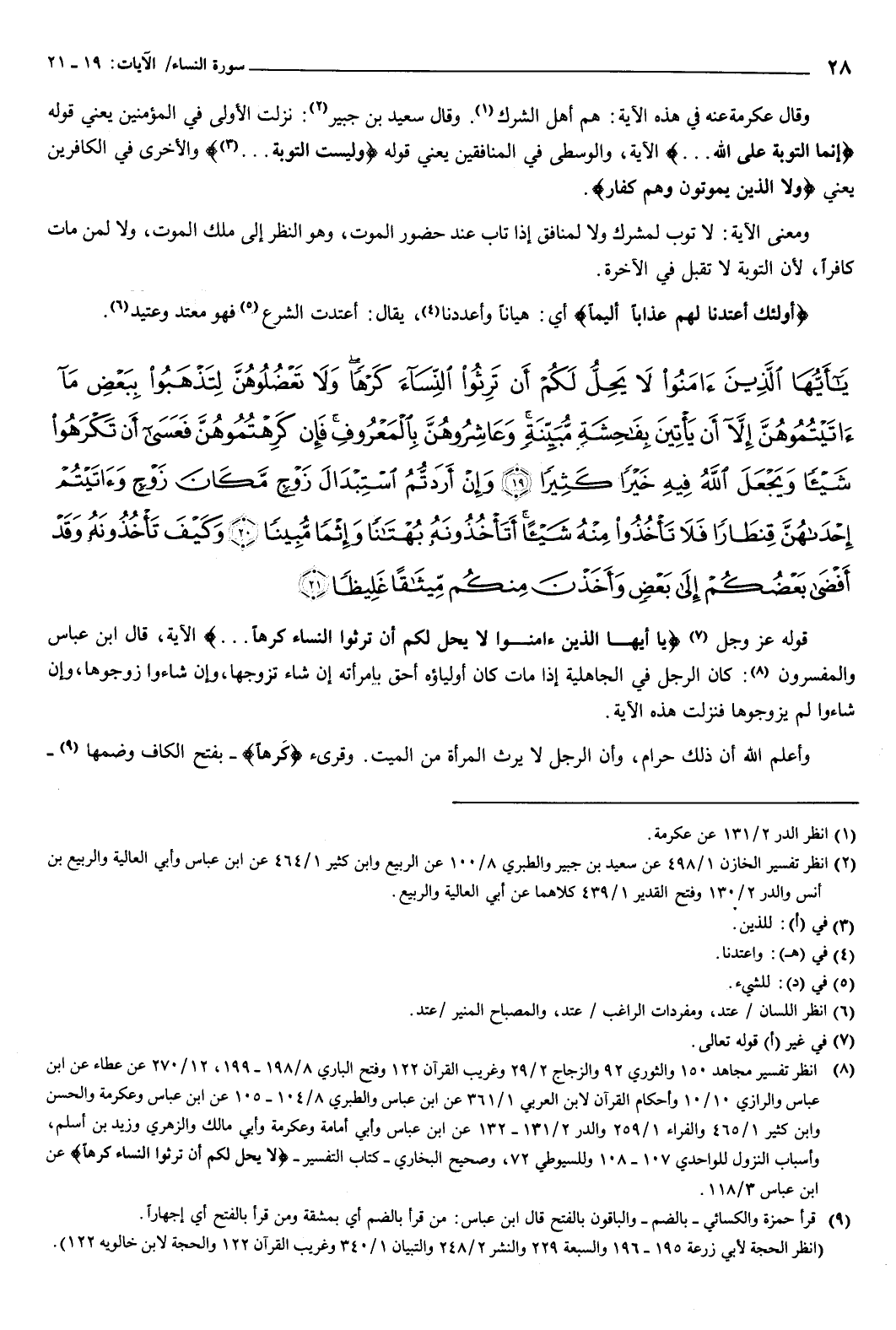 {يَأَيُّهَا الَّذِينَ آمَنُوا لا يَحِلُّ لَكُمْ أَنْ تَرِثُوا النِّسَاءَ كَرْهًا وَلا تَعْضُلُوهُنَّ لِتَذْهَبُوا بِبَعْضِ مَا آتَيْتُمُوهُنَّ إِلا أَنْ يَأْتِينَ بِفَاحِشَةٍ مُبَيِّنَةٍ وَعَاشِرُوهُنَّ بِالْمَعْرُوفِ فَإِنْ كَرِهْتُمُوهُنَّ فَعَسَى أَنْ تَكْرَهُوا شَيْئًا وَيَجْعَلَ اللَّهُ فِيهِ خَيْرًا كَثِيرًا {19} وَإِنْ أَرَدْتُمُ اسْتِبْدَالَ زَوْجٍ مَكَانَ زَوْجٍ وَآتَيْتُمْ إِحْدَاهُنَّ قِنْطَارًا فَلا تَأْخُذُوا مِنْهُ شَيْئًا أَتَأْخُذُونَهُ بُهْتَانًا وَإِثْمًا مُبِينًا {20} وَكَيْفَ تَأْخُذُونَهُ وَقَدْ أَفْضَى بَعْضُكُمْ إِلَى بَعْضٍ وَأَخَذْنَ مِنْكُمْ مِيثَاقًا غَلِيظًا {21} } [النساء: 19-21] قوله عَزَّ وَجَلّ: {يَأَيُّهَا الَّذِينَ آمَنُوا لا يَحِلُّ لَكُمْ أَنْ تَرِثُوا النِّسَاءَ كَرْهًا} [النساء: 19] الآية: قَالَ ابْن عَبَّاس والمفسرون: كان الرَّجُل فِي الْجَاهِلِيَّة إذا مات كان أولياؤه أحق بامرأته إن شاء تزوجها، وإن شاءوا زوجوها، وإن شاءوا لَمْ يزوجوها فنزلت، هَذِهِ الآية.