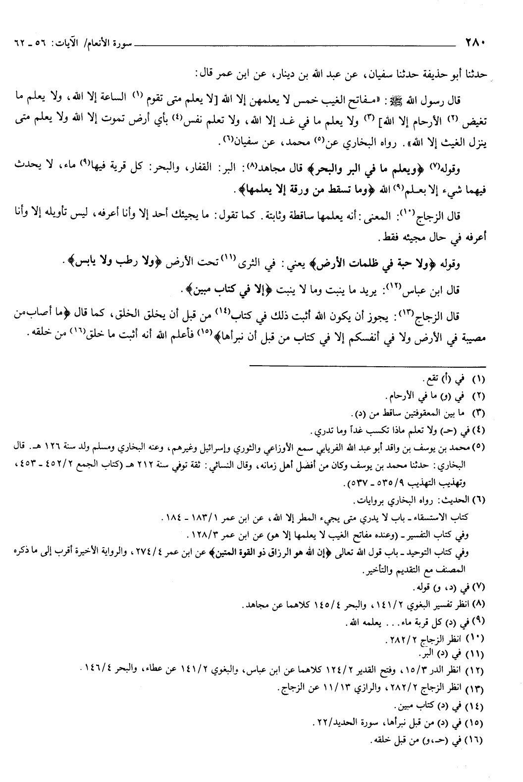 وقوله: {وَيَعْلَمُ مَا فِي الْبَرِّ وَالْبَحْرِ} [الأنعام: 59] ، قال مجاهد: البر: القفار، والبحر: كل قرية فيها ماء، لا يحدث فيهما شيء إلا بعلم الله، {وَمَا تَسْقُطُ مِنْ وَرَقَةٍ إِلا يَعْلَمُهَا} [الأنعام: 59] ، قال الزجاج: المعنى: أنه يعلمها ساقطة وثابتة، كما تقول: ما يجيئك أحد إلا وأنا أعرفه، ليس تأويله إلا وأنا أعرفه في حال مجيئه فقط.