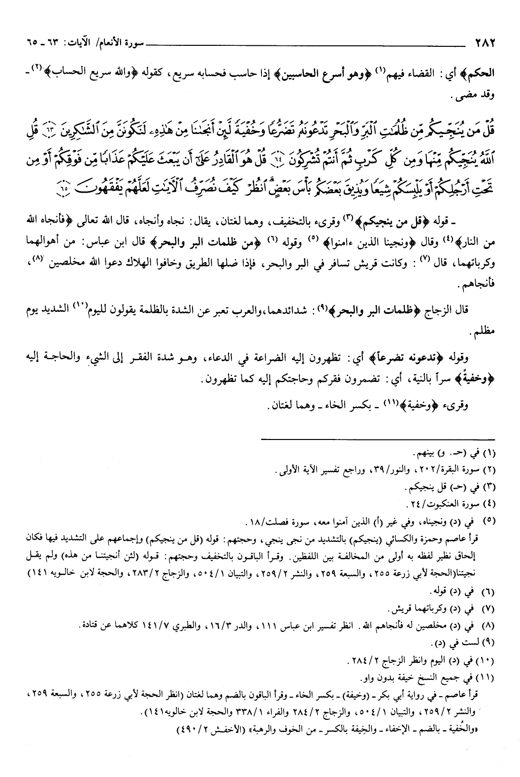 {قُلْ مَنْ يُنَجِّيكُمْ مِنْ ظُلُمَاتِ الْبَرِّ وَالْبَحْرِ تَدْعُونَهُ تَضَرُّعًا وَخُفْيَةً لَئِنْ أَنْجَانَا مِنْ هَذِهِ لَنَكُونَنَّ مِنَ الشَّاكِرِينَ {63} قُلِ اللَّهُ يُنَجِّيكُمْ مِنْهَا وَمِنْ كُلِّ كَرْبٍ ثُمَّ أَنْتُمْ تُشْرِكُونَ {64} قُلْ هُوَ الْقَادِرُ عَلَى أَنْ يَبْعَثَ عَلَيْكُمْ عَذَابًا مِنْ فَوْقِكُمْ أَوْ مِنْ تَحْتِ أَرْجُلِكُمْ أَوْ يَلْبِسَكُمْ شِيَعًا وَيُذِيقَ بَعْضَكُمْ بَأْسَ بَعْضٍ انْظُرْ كَيْفَ نُصَرِّفُ الآيَاتِ لَعَلَّهُمْ يَفْقَهُونَ {65} } [الأنعام: 63-65] قوله: {قُلْ مَنْ يُنَجِّيكُمْ} [الأنعام: 63] وقرئ بالتخفيف، وهما لغتان، يقال: نجاه وأنجاه، قال الله تعالى: {فَأَنْجَاهُ اللَّهُ مِنَ النَّارِ} [العنكبوت: 24] وقال: {وَنَجَّيْنَا الَّذِينَ آمَنُوا} [فصلت: 18] .