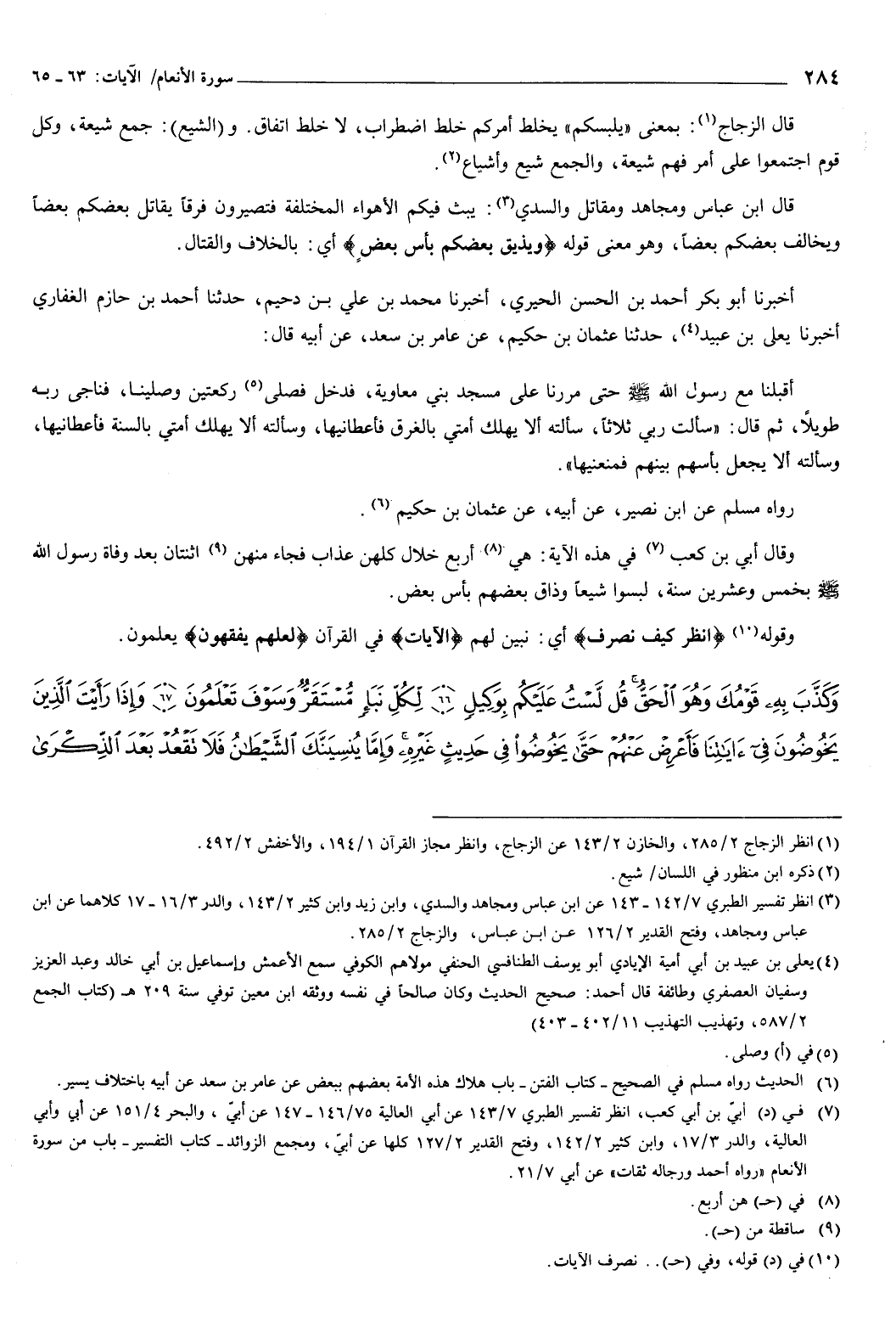 وقال أبي بن كعب في هذه الآية: هي أربع خلال كلهن عذاب، فجاء منهن اثنتان بعد وفاة رسول الله صَلَّى اللهُ عَلَيْهِ وَسَلَّمَ بخمس وعشرين سنة، لبسوا شيعا وذاق بعضهم بأس بعض.