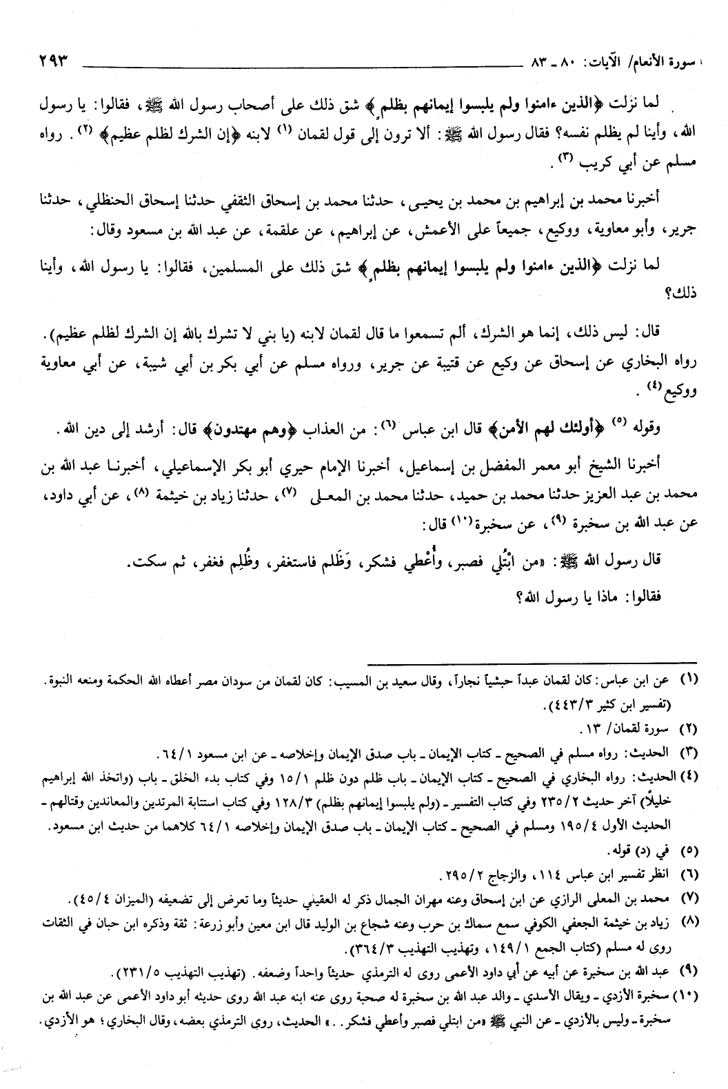 لَمَّا نَزَلَتْ {الَّذِينَ آمَنُوا وَلَمْ يَلْبِسُوا إِيمَانَهُمْ بِظُلْمٍ} [الأنعام: 82] شَقَّ ذَلِكَ عَلَى أَصْحَابِ رَسُولِ اللَّهِ صَلَّى اللهُ عَلَيْهِ وَسَلَّمَ، فَقَالُوا: يَا رَسُولَ اللَّهِ وَأَيُّنَا لَمْ يَظْلِمْ نَفْسَهُ؟ فقَالَ رَسُولُ اللَّهِ صَلَّى اللهُ عَلَيْهِ وَسَلَّمَ: " أَلَا تَرَوْنَ إِلَى قَوْلِ لُقْمَانَ لابْنِهِ {إِنَّ الشِّرْكَ لَظُلْمٌ عَظِيمٌ} [لقمان: 13] ".