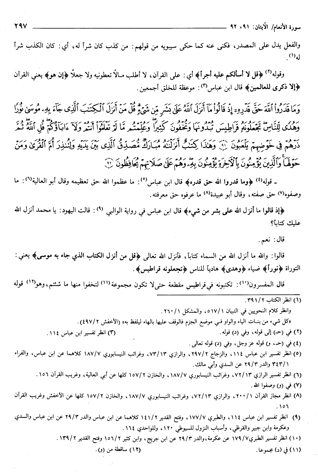 {وَمَا قَدَرُوا اللَّهَ حَقَّ قَدْرِهِ إِذْ قَالُوا مَا أَنْزَلَ اللَّهُ عَلَى بَشَرٍ مِنْ شَيْءٍ قُلْ مَنْ أَنْزَلَ الْكِتَابَ الَّذِي جَاءَ بِهِ مُوسَى نُورًا وَهُدًى لِلنَّاسِ تَجْعَلُونَهُ قَرَاطِيسَ تُبْدُونَهَا وَتُخْفُونَ كَثِيرًا وَعُلِّمْتُمْ مَا لَمْ تَعْلَمُوا أَنْتُمْ وَلا آبَاؤُكُمْ قُلِ اللَّهُ ثُمَّ ذَرْهُمْ فِي خَوْضِهِمْ يَلْعَبُونَ {91} وَهَذَا كِتَابٌ أَنْزَلْنَاهُ مُبَارَكٌ مُصَدِّقُ الَّذِي بَيْنَ يَدَيْهِ وَلِتُنْذِرَ أُمَّ الْقُرَى وَمَنْ حَوْلَهَا وَالَّذِينَ يُؤْمِنُونَ بِالآخِرَةِ يُؤْمِنُونَ بِهِ وَهُمْ عَلَى صَلاتِهِمْ يُحَافِظُونَ {92} } [الأنعام: 91-92] قوله: {وَمَا قَدَرُوا اللَّهَ حَقَّ قَدْرِهِ} [الأنعام: 91] قال ابن عباس: ما عظموا الله حق تعظيمه.