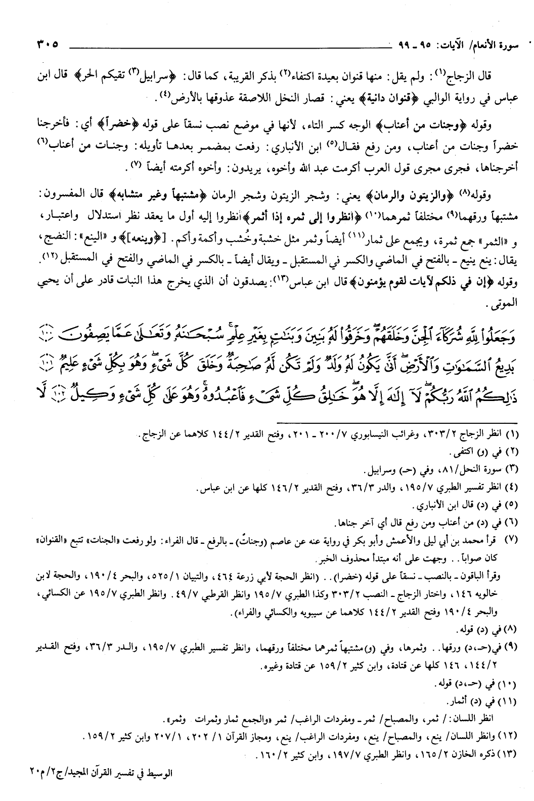 وقوله: {وَجَنَّاتٍ مِنْ أَعْنَابٍ} [الأنعام: 99] الوجه كسر التاء لأنها في موضع نصب نسقا على قوله: خضرا أي: فأخرجنا خضرا وجنات من أعناب، ومن رفع فقال ابن الأنباري: رفعت بمضمر بعدها، تأويله: وجنات من أعناب أخرجناها، فجرى مجرى قول العرب: أكرمت عبد الله وأخوه، يريدون: وأخوه أكرمته أيضا.