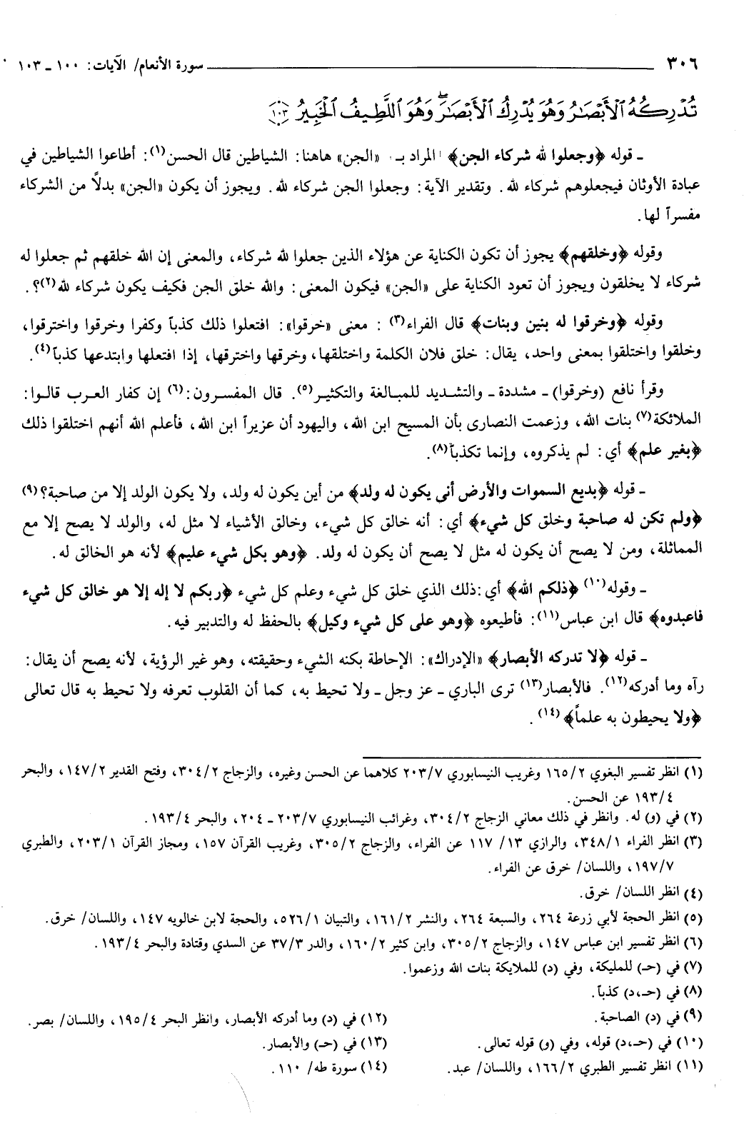 تُدْرِكُهُ الأَبْصَارُ وَهُوَ يُدْرِكُ الأَبْصَارَ وَهُوَ اللَّطِيفُ الْخَبِيرُ {103} } [الأنعام: 100-103] قوله: {وَجَعَلُوا لِلَّهِ شُرَكَاءَ الْجِنَّ} [الأنعام: 100] المراد بالجن ههنا: الشياطين، قال الحسن: أطاعوا الشياطين في عبادة الأوثان فيجعلوهم شركاء لله.