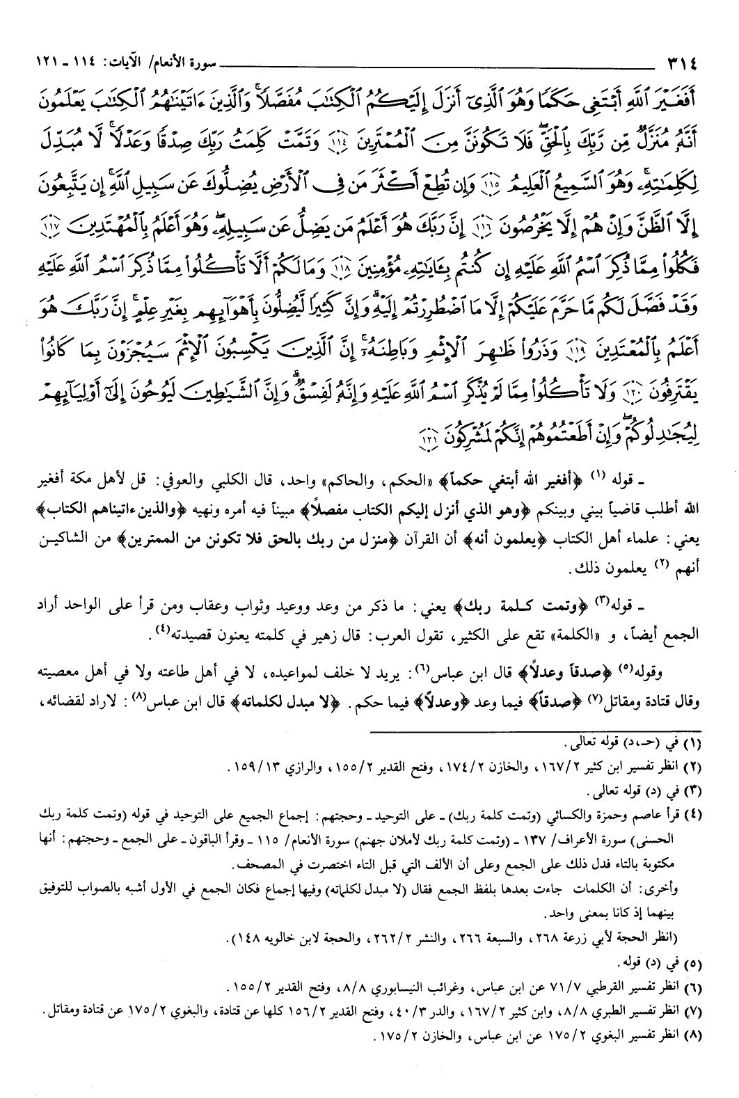 {أَفَغَيْرَ اللَّهِ أَبْتَغِي حَكَمًا وَهُوَ الَّذِي أَنْزَلَ إِلَيْكُمُ الْكِتَابَ مُفَصَّلا وَالَّذِينَ آتَيْنَاهُمُ الْكِتَابَ يَعْلَمُونَ أَنَّهُ مُنَزَّلٌ مِنْ رَبِّكَ بِالْحَقِّ فَلا تَكُونَنَّ مِنَ الْمُمْتَرِينَ {114} وَتَمَّتْ كَلِمَتُ رَبِّكَ صِدْقًا وَعَدْلا لا مُبَدِّلَ لِكَلِمَاتِهِ وَهُوَ السَّمِيعُ الْعَلِيمُ {115} وَإِنْ تُطِعْ أَكْثَرَ مَنْ فِي الأَرْضِ يُضِلُّوكَ عَنْ سَبِيلِ اللَّهِ إِنْ يَتَّبِعُونَ إِلا الظَّنَّ وَإِنْ هُمْ إِلا يَخْرُصُونَ {116} إِنَّ رَبَّكَ هُوَ أَعْلَمُ مَنْ يَضِلُّ عَنْ سَبِيلِهِ وَهُوَ أَعْلَمُ بِالْمُهْتَدِينَ {117} فَكُلُوا مِمَّا ذُكِرَ اسْمُ اللَّهِ عَلَيْهِ إِنْ كُنْتُمْ بِآيَاتِهِ مُؤْمِنِينَ {118} وَمَا لَكُمْ أَلَّا تَأْكُلُوا مِمَّا ذُكِرَ اسْمُ اللَّهِ عَلَيْهِ وَقَدْ فَصَّلَ لَكُمْ مَا حَرَّمَ عَلَيْكُمْ إِلا مَا اضْطُرِرْتُمْ إِلَيْهِ وَإِنَّ كَثِيرًا لَيُضِلُّونَ بِأَهْوَائِهِمْ بِغَيْرِ عِلْمٍ إِنَّ رَبَّكَ هُوَ أَعْلَمُ بِالْمُعْتَدِينَ {119} وَذَرُوا ظَاهِرَ الإِثْمِ وَبَاطِنَهُ إِنَّ الَّذِينَ يَكْسِبُونَ الإِثْمَ سَيُجْزَوْنَ بِمَا كَانُوا يَقْتَرِفُونَ {120} وَلا تَأْكُلُوا مِمَّا لَمْ يُذْكَرِ اسْمُ اللَّهِ عَلَيْهِ وَإِنَّهُ لَفِسْقٌ وَإِنَّ الشَّيَاطِينَ لَيُوحُونَ إِلَى أَوْلِيَائِهِمْ لِيُجَادِلُوكُمْ وَإِنْ أَطَعْتُمُوهُمْ إِنَّكُمْ لَمُشْرِكُونَ {121} } [الأنعام: 114-121] قوله: {أَفَغَيْرَ اللَّهِ أَبْتَغِي حَكَمًا} [الأنعام: 114] الحكم والحاكم واحد، قال الكلبي، والعوفي: قل لأهل مكة أفغير الله أطلب قاضيا بيني وبينكم، {وَهُوَ الَّذِي أَنْزَلَ إِلَيْكُمُ الْكِتَابَ مُفَصَّلا} [الأنعام: 114] مبينا فيه أمره ونهيه، {وَالَّذِينَ آتَيْنَاهُمُ الْكِتَابَ} [الأنعام: 114] يعني: علماء أهل الكتاب يعلمون أنه: أن القرآن {مُنَزَّلٌ مِنْ رَبِّكَ بِالْحَقِّ فَلا تَكُونَنَّ مِنَ الْمُمْتَرِينَ} [الأنعام: 114] من الشاكين أنهم يعلمون ذلك.