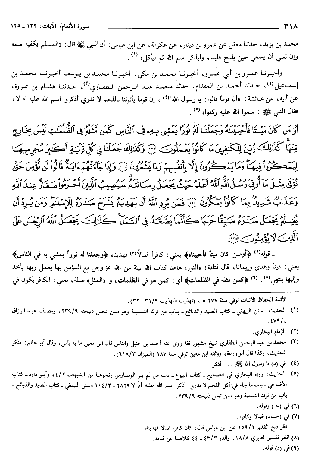 {أَوَمَنْ كَانَ مَيْتًا فَأَحْيَيْنَاهُ وَجَعَلْنَا لَهُ نُورًا يَمْشِي بِهِ فِي النَّاسِ كَمَنْ مَثَلُهُ فِي الظُّلُمَاتِ لَيْسَ بِخَارِجٍ مِنْهَا كَذَلِكَ زُيِّنَ لِلْكَافِرِينَ مَا كَانُوا يَعْمَلُونَ {122} وَكَذَلِكَ جَعَلْنَا فِي كُلِّ قَرْيَةٍ أَكَابِرَ مُجْرِمِيهَا لِيَمْكُرُوا فِيهَا وَمَا يَمْكُرُونَ إِلا بِأَنْفُسِهِمْ وَمَا يَشْعُرُونَ {123} وَإِذَا جَاءَتْهُمْ آيَةٌ قَالُوا لَنْ نُؤْمِنَ حَتَّى نُؤْتَى مِثْلَ مَا أُوتِيَ رُسُلُ اللَّهِ اللَّهُ أَعْلَمُ حَيْثُ يَجْعَلُ رِسَالَتَهُ سَيُصِيبُ الَّذِينَ أَجْرَمُوا صَغَارٌ عِنْدَ اللَّهِ وَعَذَابٌ شَدِيدٌ بِمَا كَانُوا يَمْكُرُونَ {124} فَمَنْ يُرِدِ اللَّهُ أَنْ يَهْدِيَهُ يَشْرَحْ صَدْرَهُ لِلإِسْلامِ وَمَنْ يُرِدْ أَنْ يُضِلَّهُ يَجْعَلْ صَدْرَهُ ضَيِّقًا حَرَجًا كَأَنَّمَا يَصَّعَّدُ فِي السَّمَاءِ كَذَلِكَ يَجْعَلُ اللَّهُ الرِّجْسَ عَلَى الَّذِينَ لا يُؤْمِنُونَ {125} } قوله: {أَوَمَنْ كَانَ مَيْتًا فَأَحْيَيْنَاهُ} [الأنعام: 122] يعني: كافرا ضالا فهديناه {وَجَعَلْنَا لَهُ نُورًا يَمْشِي بِهِ فِي النَّاسِ} [الأنعام: 122] يعني: دينا وهدى وإيمانا، قال قتادة: النور ههنا: كتاب الله بينة من الله عز وجل مع المؤمن بها يعمل وبها يأخذ وإليها ينتهي.