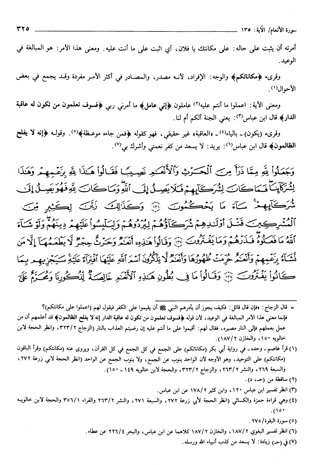 {وَجَعَلُوا لِلَّهِ مِمَّا ذَرَأَ مِنَ الْحَرْثِ وَالأَنْعَامِ نَصِيبًا فَقَالُوا هَذَا لِلَّهِ بِزَعْمِهِمْ وَهَذَا لِشُرَكَائِنَا فَمَا كَانَ لِشُرَكَائِهِمْ فَلا يَصِلُ إِلَى اللَّهِ وَمَا كَانَ لِلَّهِ فَهُوَ يَصِلُ إِلَى شُرَكَائِهِمْ سَاءَ مَا يَحْكُمُونَ {136} وَكَذَلِكَ زَيَّنَ لِكَثِيرٍ مِنَ الْمُشْرِكِينَ قَتْلَ أَوْلادِهِمْ شُرَكَاؤُهُمْ لِيُرْدُوهُمْ وَلِيَلْبِسُوا عَلَيْهِمْ دِينَهُمْ وَلَوْ شَاءَ اللَّهُ مَا فَعَلُوهُ فَذَرْهُمْ وَمَا يَفْتَرُونَ {137} وَقَالُوا هَذِهِ أَنْعَامٌ وَحَرْثٌ حِجْرٌ لا يَطْعَمُهَا إِلا مَنْ نَشَاءُ بِزَعْمِهِمْ وَأَنْعَامٌ حُرِّمَتْ ظُهُورُهَا وَأَنْعَامٌ لا يَذْكُرُونَ اسْمَ اللَّهِ عَلَيْهَا افْتِرَاءً عَلَيْهِ سَيَجْزِيهِمْ بِمَا كَانُوا يَفْتَرُونَ {138} وَقَالُوا مَا فِي بُطُونِ هَذِهِ الأَنْعَامِ خَالِصَةٌ لِذُكُورِنَا وَمُحَرَّمٌ عَلَى