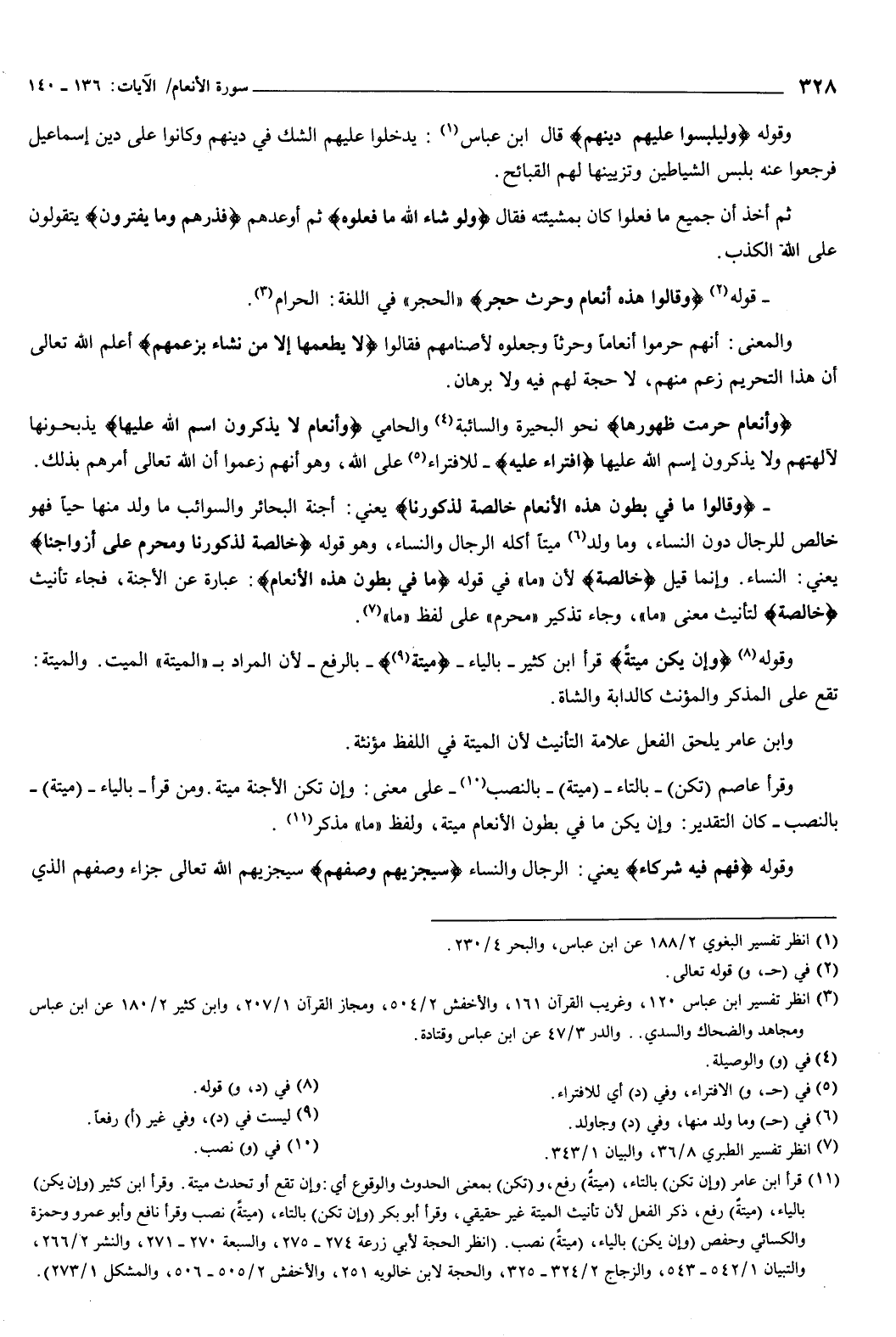 {وَأَنْعَامٌ حُرِّمَتْ ظُهُورُهَا} [الأنعام: 138] نحو البحيرة والسائبة والحامي {وَأَنْعَامٌ لا يَذْكُرُونَ اسْمَ اللَّهِ عَلَيْهَا} [الأنعام: 138] يذبحونها لآلهتهم ولا يذكرون اسم الله عليها افتراء عليه: للافتراء على الله، وهو أنهم زعموا أن الله تعالى أمرهم بذلك.
