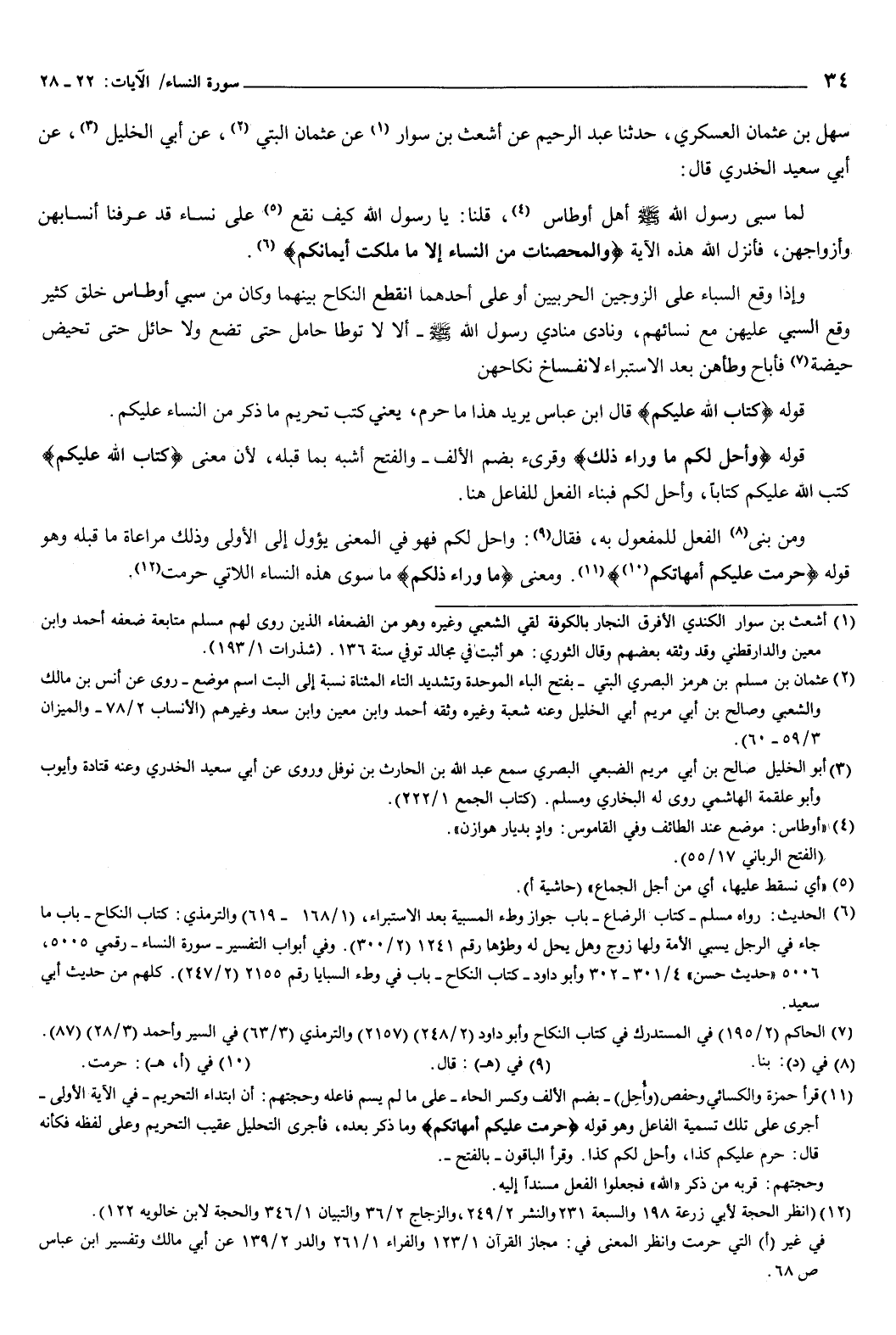 سَهْلُ بْنُ عُثْمَانَ الْعَسْكَرِيُّ، حَدَّثَنَا عَبْدُ الرَّحِيمِ، عَنْ أَشْعَثَ بْنِ سَوَّارٍ، عَنْ عُثْمَانَ الْبَتِّيِّ، عَنْ أَبِي الْخَلِيلِ، عَنْ أَبِي سَعِيدٍ الْخُدْرِيِّ قَالَ: لَمَّا سَبَى رَسُولُ اللَّهِ صَلَّى اللهُ عَلَيْهِ وَسَلَّمَ أَهْلَ أَوْطَاسَ، قُلْنَا: يَا رَسُولَ اللَّهِ كَيْفَ نَقَعُ عَلَى نِسَاءٍ قَدْ عَرَفْنَا أَنْسَابَهُنَّ وَأَزْوَاجَهُنَّ، فَأَنْزَلَ اللَّهُ هَذِهِ الآيَةَ {وَالْمُحْصَنَاتُ مِنَ النِّسَاءِ إِلا مَا مَلَكَتْ أَيْمَانُكُمْ} [النساء: 24]
