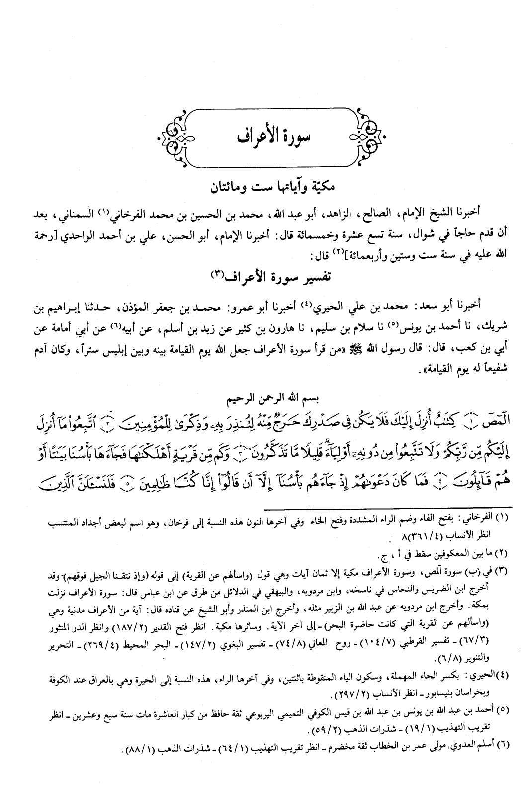 مكية وآياتها ست ومائتان أخبرنا الشيخ الإمام الصالح الزاهد أبو عبد الله محمد بن الحسين بن محمد الفرخاني السمناني، بعد أن قدم حاجا في شوال سنة تسع عشرة وخمس مائة، قال: أخبرنا الإمام أبو الحسن علي بن أحمد الواحدي، رحمة الله عليه، في سنة ست وستين وأربع مائة، قال: تفسير سورة الأعراف
