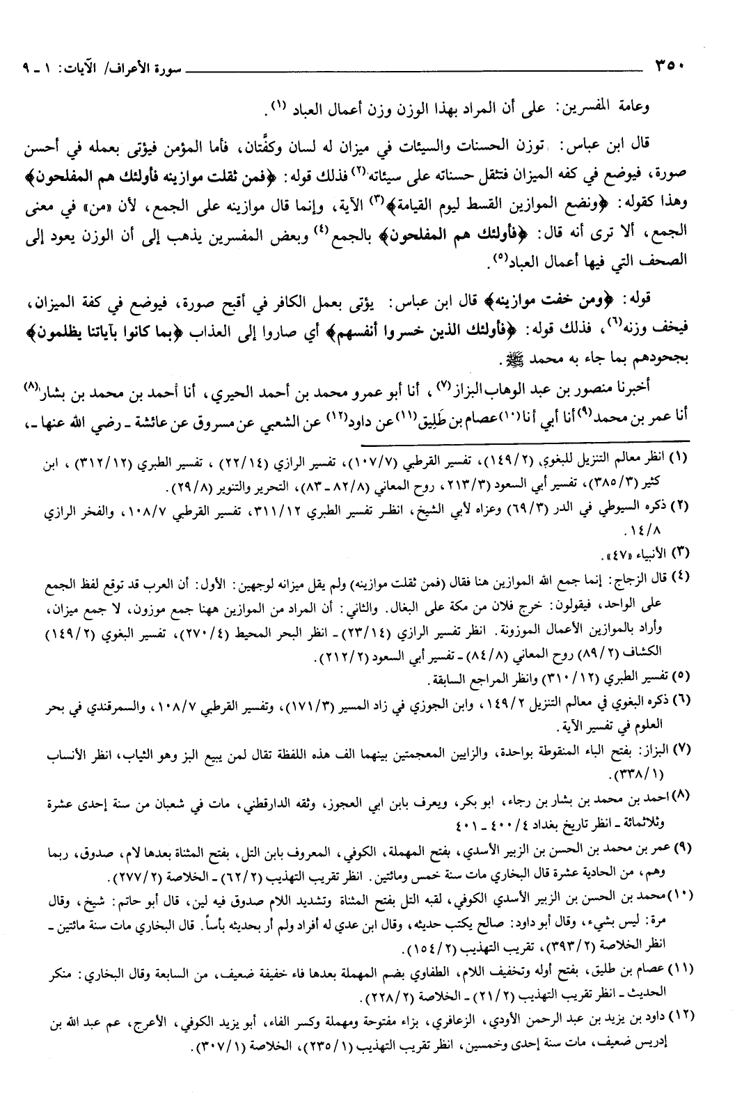 قال ابن عباس: توزن الحسنات والسيئات في ميزان له لسان وكفتان، فأما المؤمن فيؤتى بعمله في أحسن صورة، فيوضع في كفه الميزان، فتثقل حسناته على سيئاته، فذلك قوله: {فَمَنْ ثَقُلَتْ مَوَازِينُهُ فَأُولَئِكَ هُمُ الْمُفْلِحُونَ} [الأعراف: 8] ، وهذا كقوله: {وَنَضَعُ الْمَوَازِينَ الْقِسْطَ لِيَوْمِ الْقِيَامَةِ} [الأنبياء: 47] الآية، وإنما قال موازينه على الجمع، لأن من في معنى الجمع، ألا ترى أنه قال: {فَأُولَئِكَ هُمُ الْمُفْلِحُونَ} [الأعراف: 8] بالجمع، وبعض المفسرين يذهب إلى أن الوزن يعود إلى الصحف التي فيها أعمال العباد.