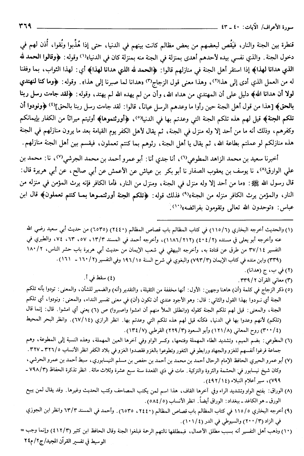 وقوله: {وَمَا كُنَّا لِنَهْتَدِيَ لَوْلا أَنْ هَدَانَا اللَّهُ} [الأعراف: 43] دليل على أن المهتدي مَن هداه الله، وأن من لم يهده الله لم يهتد، وقوله: {لَقَدْ جَاءَتْ رُسُلُ رَبِّنَا بِالْحَقِّ} [الأعراف: 43] هذا من قول أهل الجنة حين رأوا ما وعدهم الرسل عيانا، قالوا: لقد جاءت رسل ربنا بالحق، {وَنُودُوا أَنْ تِلْكُمُ الْجَنَّةُ} [الأعراف: 43] قيل لهم هذه تلكم الجنة التي وعدتم بها في الدنيا، أورثتموها: أوتيتم ميراثا من الكفار بإيمانكم وكفرهم، وذلك أنه ما من أحد إلا وله منزل في الجنة، ثم يقال لأهل الكفر يوم القيامة بعد ما يرون منازلهم في الجنة: هذه منازلكم لو عملتم بطاعة الله.