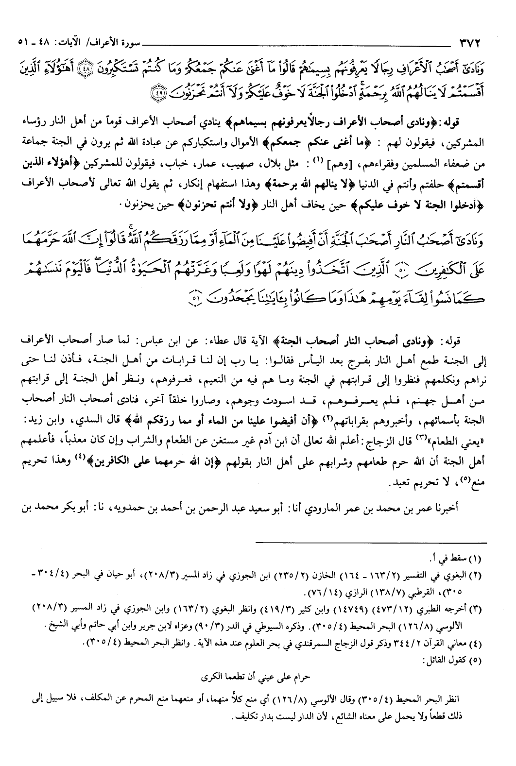 {وَنَادَى أَصْحَابُ الأَعْرَافِ رِجَالا يَعْرِفُونَهُمْ بِسِيمَاهُمْ قَالُوا مَا أَغْنَى عَنْكُمْ جَمْعُكُمْ وَمَا كُنْتُمْ تَسْتَكْبِرُونَ {48} أَهَؤُلاءِ الَّذِينَ أَقْسَمْتُمْ لا يَنَالُهُمُ اللَّهُ بِرَحْمَةٍ ادْخُلُوا الْجَنَّةَ لا خَوْفٌ عَلَيْكُمْ وَلا أَنْتُمْ تَحْزَنُونَ {49} } [الأعراف: 48-49] قوله: {وَنَادَى أَصْحَابُ الأَعْرَافِ رِجَالا يَعْرِفُونَهُمْ بِسِيمَاهُمْ} [الأعراف: 48] ينادي أصحاب الأعراف قوما من أهل النار رؤساء المشركين، فيقولون لهم: {مَا أَغْنَى عَنْكُمْ جَمْعُكُمْ} [الأعراف: 48] الأموال واستكبارهم عن عبادة الله ثم يرون في الجنة جماعة من ضعفاء المسلمين وفقراءهم، وهم: مثل بلال، صهيب، عمار، خباب، فيقولون للمشركين: {أَهَؤُلاءِ الَّذِينَ أَقْسَمْتُمْ} [الأعراف: 49] حلفتم وأنتم في الدنيا: {لا يَنَالُهُمُ اللَّهُ بِرَحْمَةٍ} [الأعراف: 49] ، وهذا استفهام إنكار، ثم يقول الله تعالى لأصحاب الأعراف {ادْخُلُوا الْجَنَّةَ لا خَوْفٌ عَلَيْكُمْ} [الأعراف: 49] حين يخاف أهل النار، {وَلا أَنْتُمْ تَحْزَنُونَ} [الأعراف: 49] حين يحزنون.