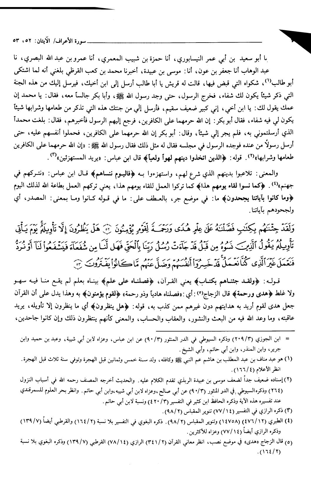 {وَلَقَدْ جِئْنَاهُمْ بِكِتَابٍ فَصَّلْنَاهُ عَلَى عِلْمٍ هُدًى وَرَحْمَةً لِقَوْمٍ يُؤْمِنُونَ {52} هَلْ يَنْظُرُونَ إِلا تَأْوِيلَهُ يَوْمَ يَأْتِي تَأْوِيلُهُ يَقُولُ الَّذِينَ نَسُوهُ مِنْ قَبْلُ قَدْ جَاءَتْ رُسُلُ رَبِّنَا بِالْحَقِّ فَهَلْ لَنَا مِنْ شُفَعَاءَ فَيَشْفَعُوا لَنَا أَوْ نُرَدُّ فَنَعْمَلَ غَيْرَ الَّذِي كُنَّا نَعْمَلُ قَدْ خَسِرُوا أَنْفُسَهُمْ وَضَلَّ عَنْهُمْ مَا كَانُوا يَفْتَرُونَ {53} } [الأعراف: 52-53] قوله: {وَلَقَدْ جِئْنَاهُمْ بِكِتَابٍ} [الأعراف: 52] يعني القرآن، {فَصَّلْنَاهُ عَلَى عِلْمٍ} [الأعراف: 52] بيناه بعلم لم يقع منا فيه سهو ولا غلط، هدى ورحمة: قال الزجاج: أي: فصلناه هاديا وذا رحمة لقوم يؤمنون: به، وهذا يدل على أن القرآن جعل هدى لقوم أريد به هدايتهم دون غيرهم ممن كذب به، قوله: هل ينظرون أي: ما ينظرون إلا تأويله، يريد: عاقبته، وما وعد الله فيه من البعث والنشور، والعقاب والحساب، والمعنى: كأنهم ينتظرون ذلك وإن كانوا جاحدين،
