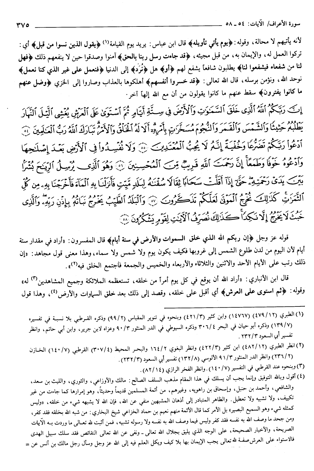 {إِنَّ رَبَّكُمُ اللَّهُ الَّذِي خَلَقَ السَّمَوَاتِ وَالأَرْضَ فِي سِتَّةِ أَيَّامٍ ثُمَّ اسْتَوَى عَلَى الْعَرْشِ يُغْشِي اللَّيْلَ النَّهَارَ يَطْلُبُهُ حَثِيثًا وَالشَّمْسَ وَالْقَمَرَ وَالنُّجُومَ مُسَخَّرَاتٍ بِأَمْرِهِ أَلا لَهُ الْخَلْقُ وَالأَمْرُ تَبَارَكَ اللَّهُ رَبُّ الْعَالَمِينَ {54} ادْعُوا رَبَّكُمْ تَضَرُّعًا وَخُفْيَةً إِنَّهُ لا يُحِبُّ الْمُعْتَدِينَ {55} وَلا تُفْسِدُوا فِي الأَرْضِ بَعْدَ إِصْلاحِهَا وَادْعُوهُ خَوْفًا وَطَمَعًا إِنَّ رَحْمَتَ اللَّهِ قَرِيبٌ مِنَ الْمُحْسِنِينَ {56} وَهُوَ الَّذِي يُرْسِلُ الرِّيَاحَ بُشْرًا بَيْنَ يَدَيْ رَحْمَتِهِ حَتَّى إِذَا أَقَلَّتْ سَحَابًا ثِقَالا سُقْنَاهُ لِبَلَدٍ مَيِّتٍ فَأَنْزَلْنَا بِهِ الْمَاءَ فَأَخْرَجْنَا بِهِ مِنْ كُلِّ الثَّمَرَاتِ كَذَلِكَ نُخْرِجُ الْمَوْتَى لَعَلَّكُمْ تَذَكَّرُونَ {57} وَالْبَلَدُ الطَّيِّبُ يَخْرُجُ نَبَاتُهُ بِإِذْنِ رَبِّهِ وَالَّذِي خَبُثَ لا يَخْرُجُ إِلا نَكِدًا كَذَلِكَ نُصَرِّفُ الآيَاتِ لِقَوْمٍ يَشْكُرُونَ {58} } [الأعراف: 54-58] قوله: {إِنَّ رَبَّكُمُ اللَّهُ الَّذِي خَلَقَ السَّمَوَاتِ وَالأَرْضَ فِي سِتَّةِ أَيَّامٍ} [الأعراف: 54] قال المفسرون: أراد في مقدار ستة أيام لأن اليوم من لدن طلوع الشمس إلى غروبها، فكيف يكون يوم ولا شمس ولا سماء.