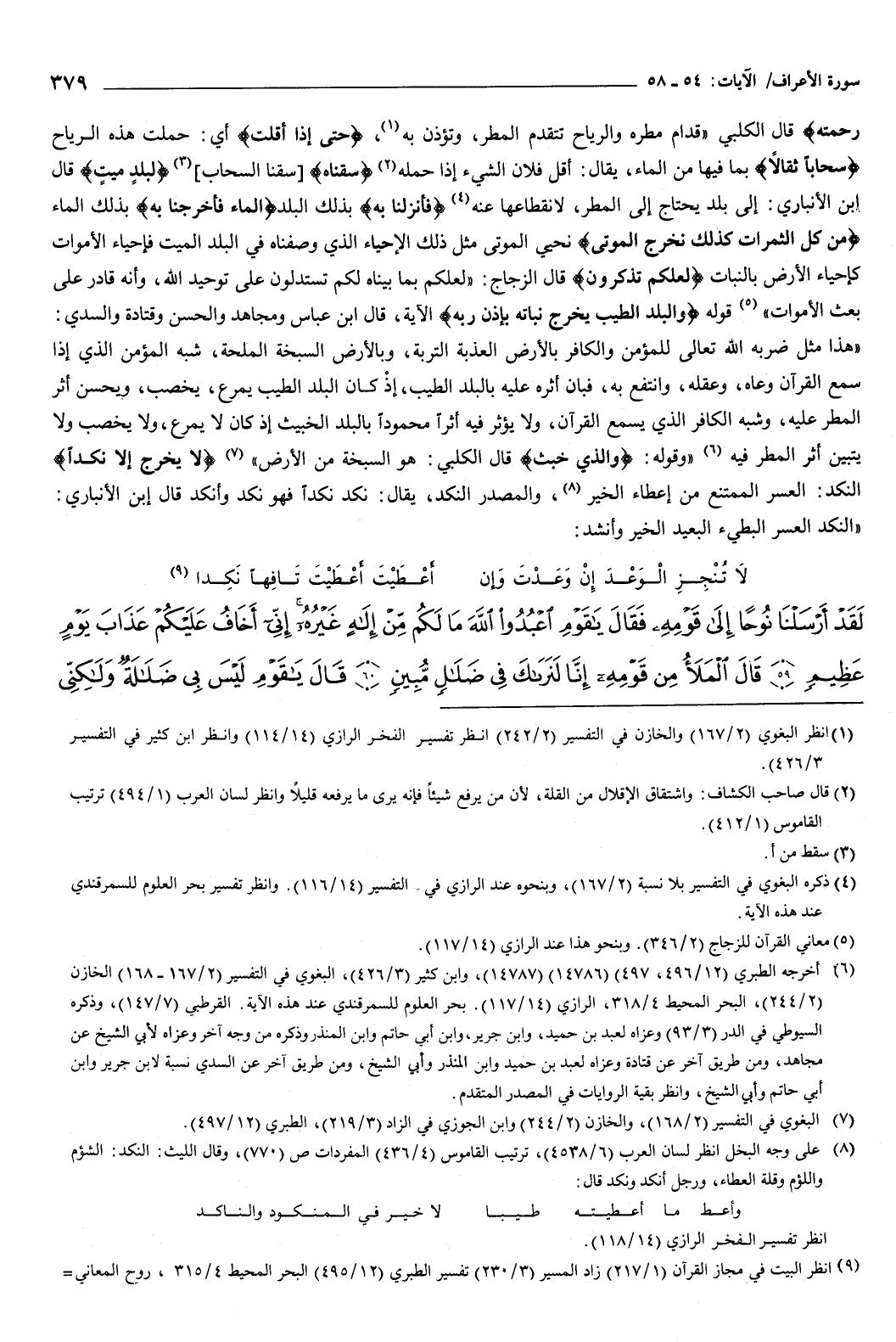 {حَتَّى إِذَا أَقَلَّتْ} [الأعراف: 57] أي: حملت هذه الرياح سحابا ثقالا: بما فيها من الماء، يقال: أقل فلان الشيء إذا حمله، {سُقْنَاهُ} [الأعراف: 57] سقنا السحاب لبلد ميت: قال ابن الأنباري: إلى بلد يحتاج إلى المطر لانقطاعها عنه، فأنزلنا به: بذلك البلد {الْمَاءَ فَأَخْرَجْنَا بِهِ} [الأعراف: 57] بذلك الماء {مِنْ كُلِّ الثَّمَرَاتِ كَذَلِكَ نُخْرِجُ الْمَوْتَى} [الأعراف: 57] نحيي الموتى مثل ذلك الإحياء الذي وصفناه في البلد الميت، فإحياء الأموات كإحياء الأرض بالنبات، لعلكم تذكرون: قال الزجاج: لعلكم بما بيناه لكم تستدلون على توحيد الله، وأنه قادر على بعث الأموات.