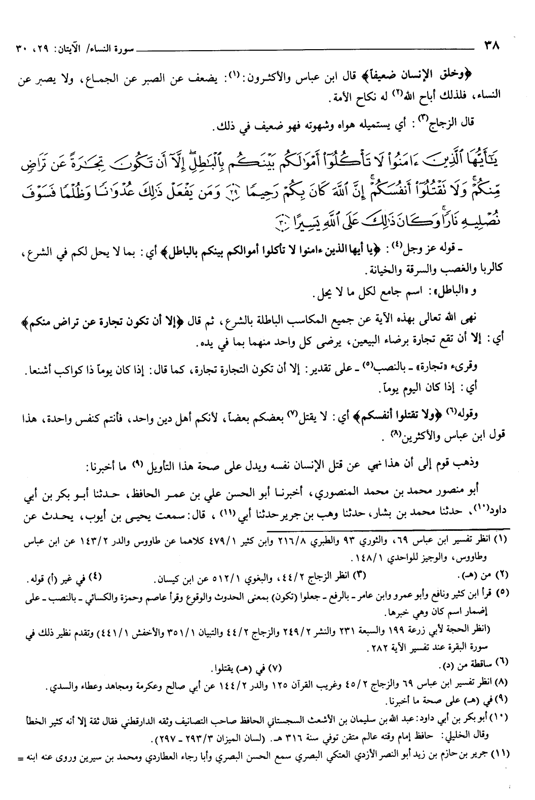 {يَأَيُّهَا الَّذِينَ آمَنُوا لا تَأْكُلُوا أَمْوَالَكُمْ بَيْنَكُمْ بِالْبَاطِلِ إِلا أَنْ تَكُونَ تِجَارَةً عَنْ تَرَاضٍ مِنْكُمْ وَلا تَقْتُلُوا أَنْفُسَكُمْ إِنَّ اللَّهَ كَانَ بِكُمْ رَحِيمًا {29} وَمَنْ يَفْعَلْ ذَلِكَ عُدْوَانًا وَظُلْمًا فَسَوْفَ نُصْلِيهِ نَارًا وَكَانَ ذَلِكَ عَلَى اللَّهِ يَسِيرًا {30} } [النساء: 29-30] قوله عَزَّ وَجَلّ: {يَأَيُّهَا الَّذِينَ آمَنُوا لا تَأْكُلُوا أَمْوَالَكُمْ بَيْنَكُمْ بِالْبَاطِلِ} [النساء: 29] أَيّ: بما لَا يحل لَكُمْ فِي الشرع، كالربا والغصب والسرقة والخيانة.