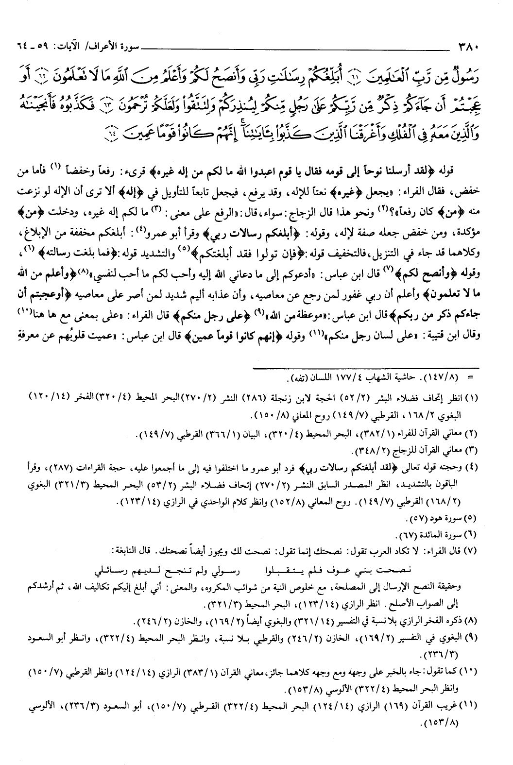 رَسُولٌ مِنْ رَبِّ الْعَالَمِينَ {61} أُبَلِّغُكُمْ رِسَالاتِ رَبِّي وَأَنْصَحُ لَكُمْ وَأَعْلَمُ مِنَ اللَّهِ مَا لا تَعْلَمُونَ {62} أَوَعَجِبْتُمْ أَنْ جَاءَكُمْ ذِكْرٌ مِنْ رَبِّكُمْ عَلَى رَجُلٍ مِنْكُمْ لِيُنْذِرَكُمْ وَلِتَتَّقُوا وَلَعَلَّكُمْ تُرْحَمُونَ {63} فَكَذَّبُوهُ فَأَنْجَيْنَاهُ وَالَّذِينَ مَعَهُ فِي الْفُلْكِ وَأَغْرَقْنَا الَّذِينَ كَذَّبُوا بِآيَاتِنَا إِنَّهُمْ كَانُوا قَوْمًا عَمِينَ {64} } [الأعراف: 59-64] قوله: {لَقَدْ أَرْسَلْنَا نُوحًا إِلَى قَوْمِهِ فَقَالَ يَا قَوْمِ اعْبُدُوا اللَّهَ مَا لَكُمْ مِنْ إِلَهٍ غَيْرُهُ} [الأعراف: 59] قرئ: رفعا وخفضا، فأما من خفض، فقال الفراء: يجعل غيرِه نعتا للإله وقد يرفع، فيجعل تابعا للتأويل في إله ألا ترى أن الإله لو نزعت منه مِن كان رفعا؟ ونحو هذا قال الزجاج سواء، قال: الرفع على معنى: ما لكم إله غيره، ودخلت من مؤكدة، ومن خفض جعله صفة لإله.