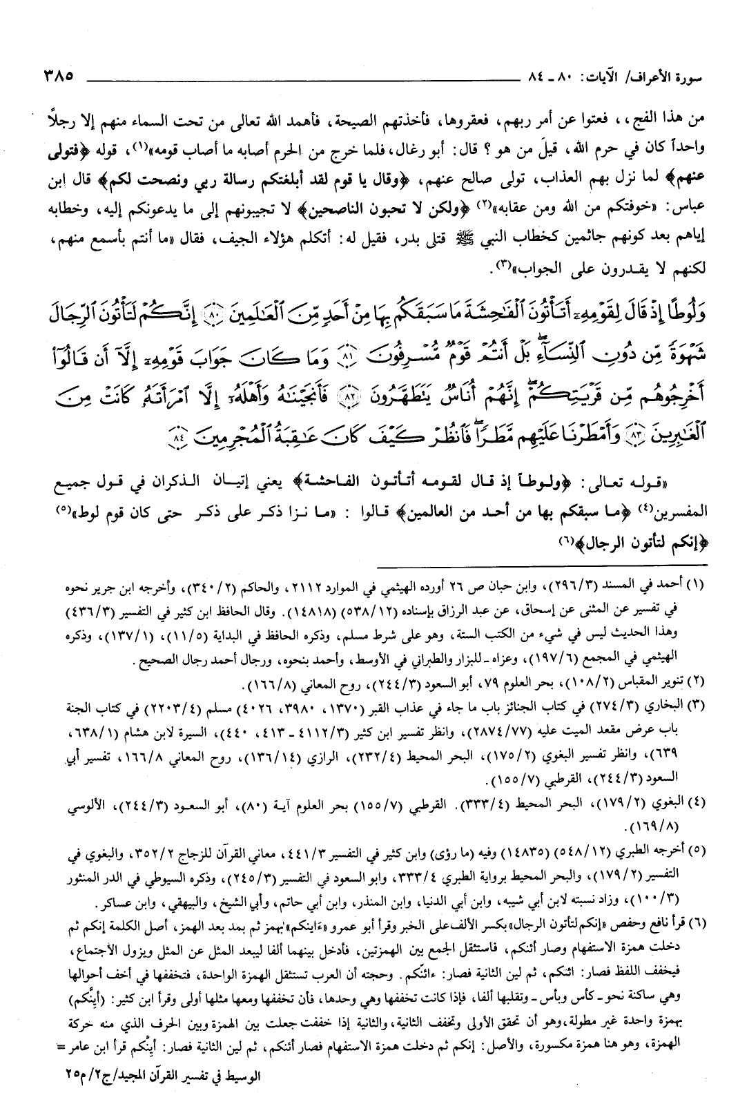 {وَلُوطًا إِذْ قَالَ لِقَوْمِهِ أَتَأْتُونَ الْفَاحِشَةَ مَا سَبَقَكُمْ بِهَا مِنْ أَحَدٍ مِنَ الْعَالَمِينَ {80} إِنَّكُمْ لَتَأْتُونَ الرِّجَالَ شَهْوَةً مِنْ دُونِ النِّسَاءِ بَلْ أَنْتُمْ قَوْمٌ مُسْرِفُونَ {81} وَمَا كَانَ جَوَابَ قَوْمِهِ إِلا أَنْ قَالُوا أَخْرِجُوهُمْ مِنْ قَرْيَتِكُمْ إِنَّهُمْ أُنَاسٌ يَتَطَهَّرُونَ {82} فَأَنْجَيْنَاهُ وَأَهْلَهُ إِلا امْرَأَتَهُ كَانَتْ مِنَ الْغَابِرِينَ {83} وَأَمْطَرْنَا عَلَيْهِمْ مَطَرًا فَانْظُرْ كَيْفَ كَانَ عَاقِبَةُ الْمُجْرِمِينَ {84} } [الأعراف: 80-84] قوله تعالى: {وَلُوطًا إِذْ قَالَ لِقَوْمِهِ أَتَأْتُونَ الْفَاحِشَةَ} [الأعراف: 80] يعني: إتيان الذكران، في قول جميع المفسرين {مَا سَبَقَكُمْ بِهَا مِنْ أَحَدٍ مِنَ الْعَالَمِينَ} [الأعراف: 80] قالوا: ما نزا ذكر على ذكر حتى كان قوم لوط.