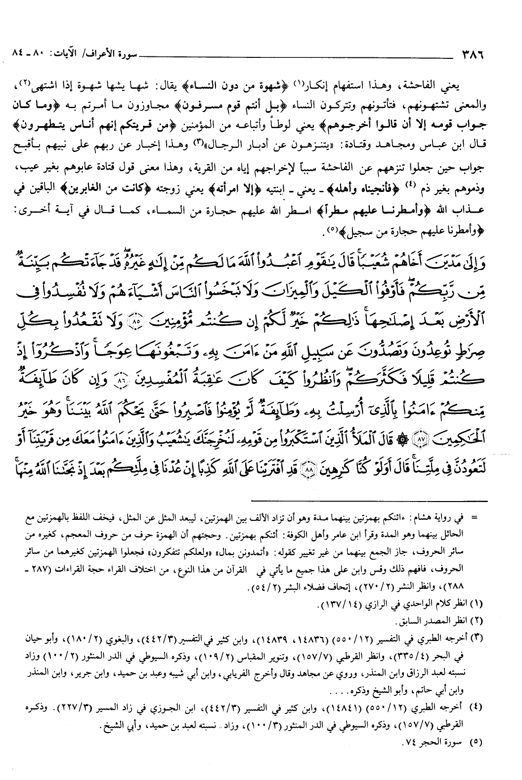{وَإِلَى مَدْيَنَ أَخَاهُمْ شُعَيْبًا قَالَ يَا قَوْمِ اعْبُدُوا اللَّهَ مَا لَكُمْ مِنْ إِلَهٍ غَيْرُهُ قَدْ جَاءَتْكُمْ بَيِّنَةٌ مِنْ رَبِّكُمْ فَأَوْفُوا الْكَيْلَ وَالْمِيزَانَ وَلا تَبْخَسُوا النَّاسَ أَشْيَاءَهُمْ وَلا تُفْسِدُوا فِي الأَرْضِ بَعْدَ إِصْلاحِهَا ذَلِكُمْ خَيْرٌ لَكُمْ إِنْ كُنْتُمْ مُؤْمِنِينَ {85} وَلا تَقْعُدُوا بِكُلِّ صِرَاطٍ تُوعِدُونَ وَتَصُدُّونَ عَنْ سَبِيلِ اللَّهِ مَنْ آمَنَ بِهِ وَتَبْغُونَهَا عِوَجًا وَاذْكُرُوا إِذْ كُنْتُمْ قَلِيلا فَكَثَّرَكُمْ وَانْظُرُوا كَيْفَ كَانَ عَاقِبَةُ الْمُفْسِدِينَ {86} وَإِنْ كَانَ طَائِفَةٌ مِنْكُمْ آمَنُوا بِالَّذِي أُرْسِلْتُ بِهِ وَطَائِفَةٌ لَمْ يُؤْمِنُوا فَاصْبِرُوا حَتَّى يَحْكُمَ اللَّهُ بَيْنَنَا وَهُوَ خَيْرُ الْحَاكِمِينَ {87} قَالَ الْمَلأُ الَّذِينَ اسْتَكْبَرُوا مِنْ قَوْمِهِ لَنُخْرِجَنَّكَ يَا شُعَيْبُ وَالَّذِينَ آمَنُوا مَعَكَ مِنْ قَرْيَتِنَا أَوْ لَتَعُودُنَّ فِي مِلَّتِنَا قَالَ أَوَ لَوْ كُنَّا كَارِهِينَ {88} قَدِ افْتَرَيْنَا عَلَى اللَّهِ كَذِبًا إِنْ عُدْنَا فِي مِلَّتِكُمْ بَعْدَ إِذْ نَجَّانَا اللَّهُ مِنْهَا