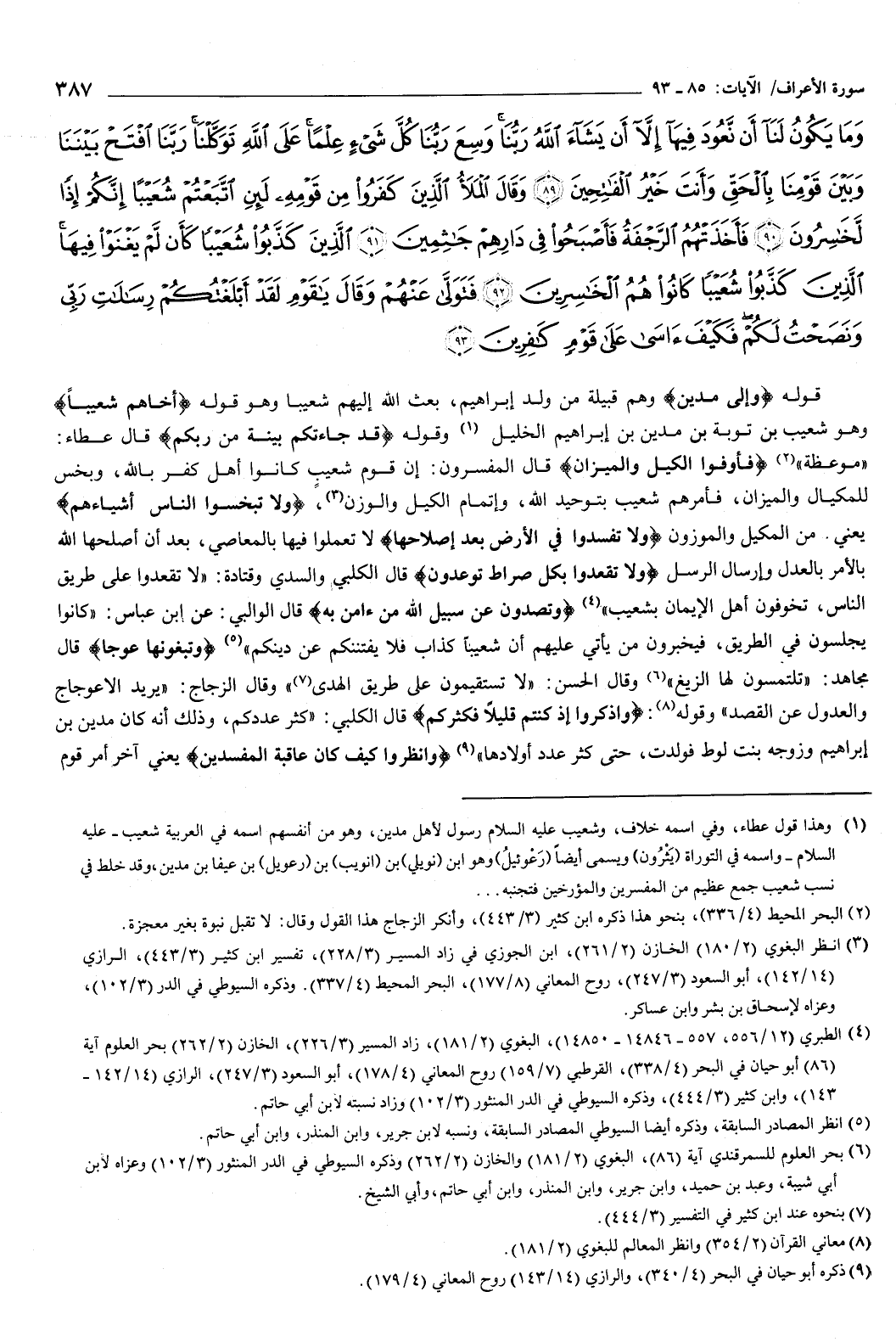 وَمَا يَكُونُ لَنَا أَنْ نَعُودَ فِيهَا إِلا أَنْ يَشَاءَ اللَّهُ رَبُّنَا وَسِعَ رَبُّنَا كُلَّ شَيْءٍ عِلْمًا عَلَى اللَّهِ تَوَكَّلْنَا رَبَّنَا افْتَحْ بَيْنَنَا وَبَيْنَ قَوْمِنَا بِالْحَقِّ وَأَنْتَ خَيْرُ الْفَاتِحِينَ {89} وَقَالَ الْمَلأُ الَّذِينَ كَفَرُوا مِنْ قَوْمِهِ لَئِنِ اتَّبَعْتُمْ شُعَيْبًا إِنَّكُمْ إِذًا لَخَاسِرُونَ {90} فَأَخَذَتْهُمُ الرَّجْفَةُ فَأَصْبَحُوا فِي دَارِهِمْ جَاثِمِينَ {91} الَّذِينَ كَذَّبُوا شُعَيْبًا كَأَنْ لَمْ يَغْنَوْا فِيهَا الَّذِينَ كَذَّبُوا شُعَيْبًا كَانُوا هُمُ الْخَاسِرِينَ {92} فَتَوَلَّى عَنْهُمْ وَقَالَ يَا قَوْمِ لَقَدْ أَبْلَغْتُكُمْ رِسَالاتِ رَبِّي وَنَصَحْتُ لَكُمْ فَكَيْفَ آسَى عَلَى قَوْمٍ كَافِرِينَ {93} } [الأعراف: 85-93] قوله: وإلى مدين وهم قبيلة من ولد إبراهيم، بعث الله إليهم شعيبا وهو قوله: أخاهم شعيبا وهو شعيب بن توبة بن مدين بن إبراهيم الخليل.