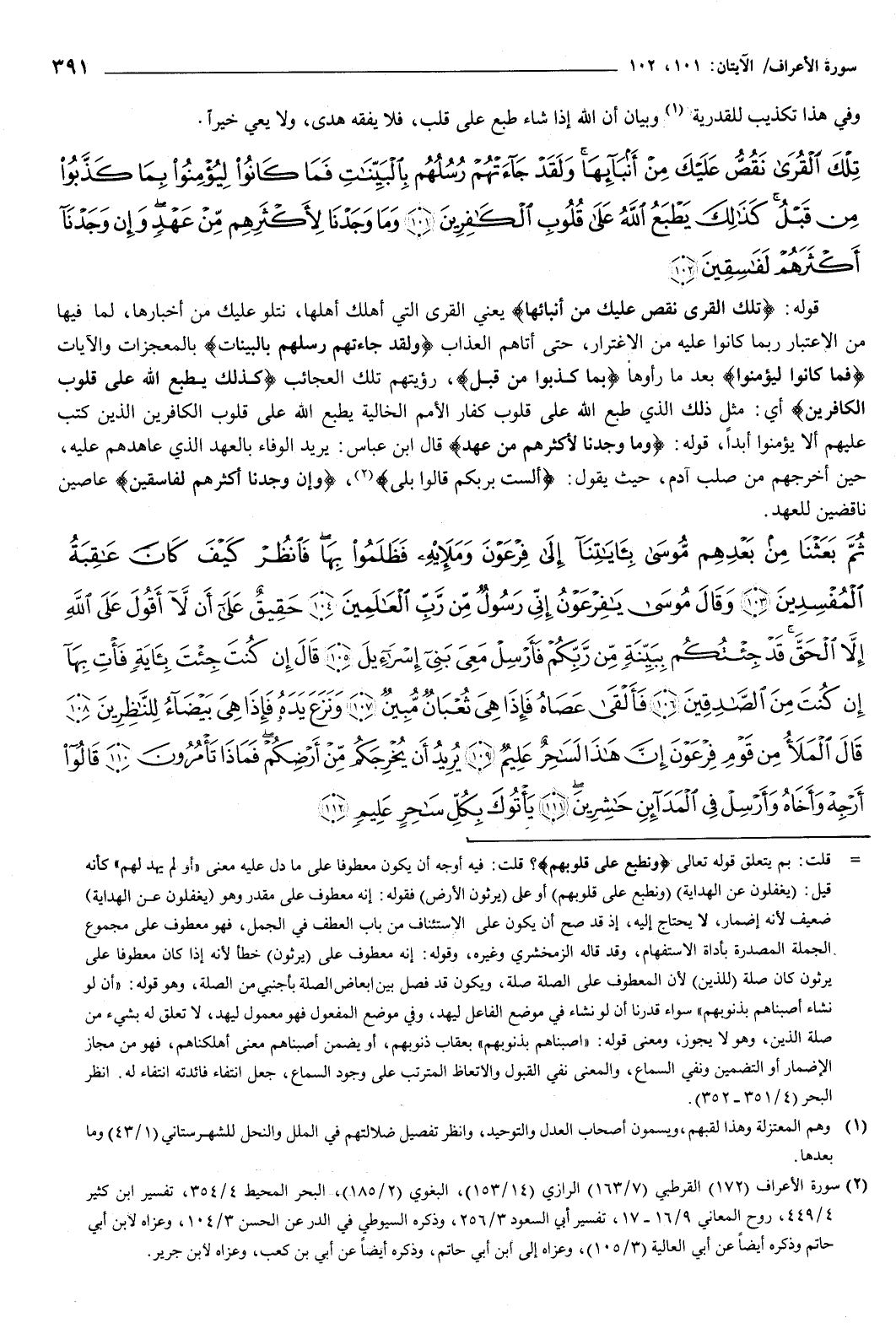 {تِلْكَ الْقُرَى نَقُصُّ عَلَيْكَ مِنْ أَنْبَائِهَا وَلَقَدْ جَاءَتْهُمْ رُسُلُهُمْ بِالْبَيِّنَاتِ فَمَا كَانُوا لِيُؤْمِنُوا بِمَا كَذَّبُوا مِنْ قَبْلُ كَذَلِكَ يَطْبَعُ اللَّهُ عَلَى قُلُوبِ الْكَافِرِينَ {101} وَمَا وَجَدْنَا لأَكْثَرِهِمْ مِنْ عَهْدٍ وَإِنْ وَجَدْنَا أَكْثَرَهُمْ لَفَاسِقِينَ {102} } قوله: {تِلْكَ الْقُرَى نَقُصُّ عَلَيْكَ مِنْ أَنْبَائِهَا} [الأعراف: 101] يعني القرى التي أهلك أهلها، نتلو عليك من أخبارها، لما فيها من الاعتبار بما كانوا عليه من الاغترار، حتى أتاهم العذاب، {وَلَقَدْ جَاءَتْهُمْ رُسُلُهُمْ بِالْبَيِّنَاتِ} [الأعراف: 101] بالمعجزات والآيات، {فَمَا كَانُوا لِيُؤْمِنُوا} [الأعراف: 101] بعد ما رأوها بما كذبوا من قبل رؤيتهم تلك العجائب، {كَذَلِكَ يَطْبَعُ اللَّهُ عَلَى قُلُوبِ الْكَافِرِينَ} [الأعراف: 101] أي: مثل ذلك الذي طبع على قلوب كفار الأمم الخالية يطبع الله على قلوب الكافرين الذين كتب عليهم ألا يؤمنوا أبدا.