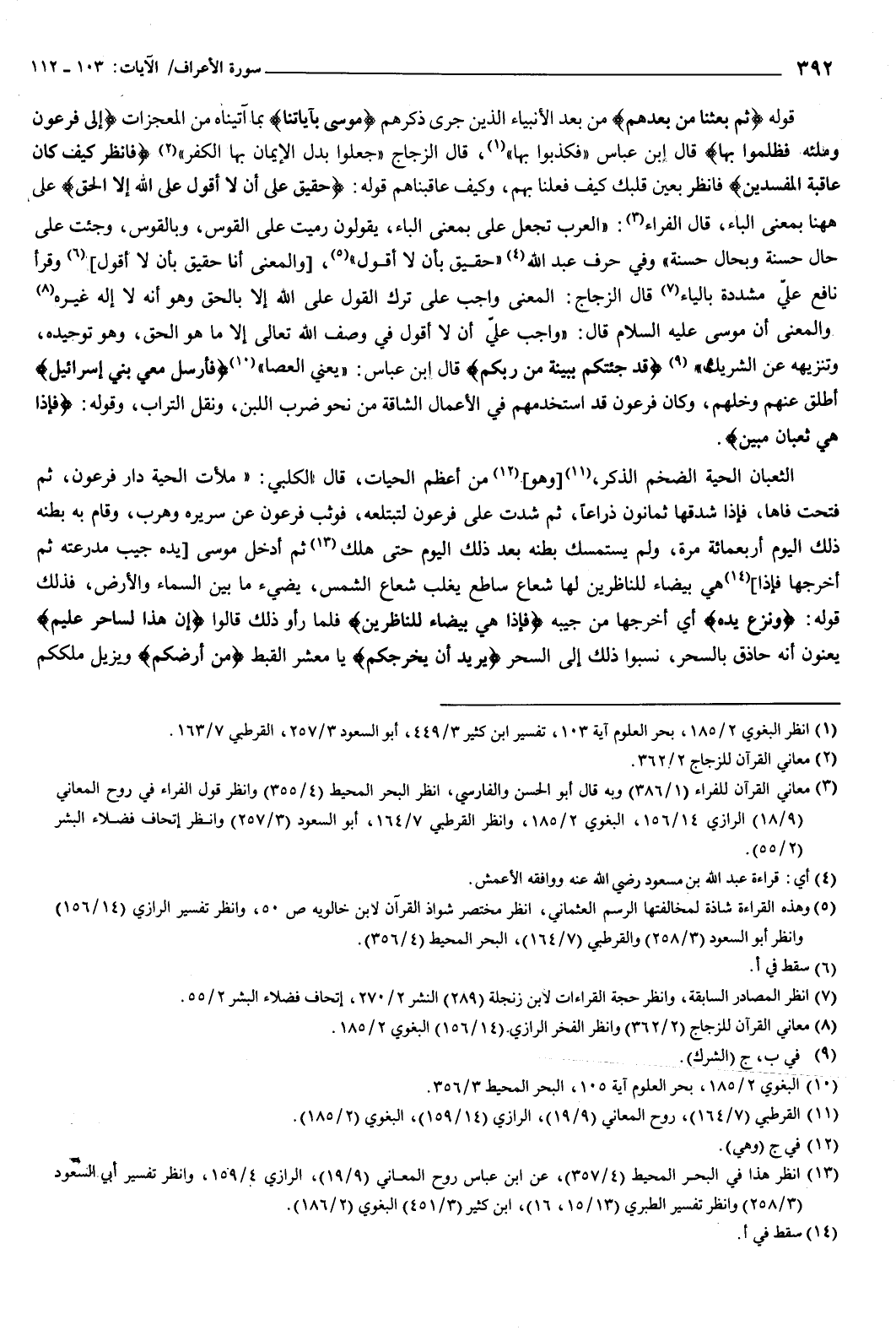 {فَأَرْسِلْ مَعِيَ بَنِي إِسْرَائِيلَ} [الأعراف: 105] أطلق عنهم وخلِّهم، وكان فرعون قد استخدمهم في الأعمال الشاقة من نحو ضرب اللبن، ونقل التراب، وقوله: {فَإِذَا هِيَ ثُعْبَانٌ مُبِينٌ} [الأعراف: 107] الثعبان: الحية الضخم الذكر، وهو من أعظم الحيات، قال الكلبي: ملأت الحية دار فرعون، ثم فتحت فاها، فإذا شدقها ثمانون ذراعا، ثم شدت على فرعون لتبتلعه، فوثب فرعون عن سريره وهرب، وقام به بطنه ذلك اليوم أربع مائة مرة، ولم يستمسك بطنه بعد ذلك اليوم حتى هلك، ثم أدخل موسى يده جيب مدرعته، ثم أخرجها فإذا هي بيضاء للناظرين لها شعاع ساطع يغلب شعاع الشمس، يضيء ما بين السماء والأرض، فذلك قوله: ونزع يده أي: أخرجها من جيبه، {فَإِذَا هِيَ بَيْضَاءُ لِلنَّاظِرِينَ} [الأعراف: 108] ، فلما رأوا ذلك قالوا: {إِنَّ هَذَا لَسَاحِرٌ عَلِيمٌ} [الأعراف: 109] يعنون أنه حاذق بالسحر، نسبوا ذلك إلى السحر.