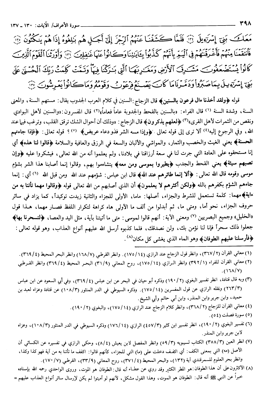 مَعَكَ بَنِي إِسْرَائِيلَ {134} فَلَمَّا كَشَفْنَا عَنْهُمُ الرِّجْزَ إِلَى أَجَلٍ هُمْ بَالِغُوهُ إِذَا هُمْ يَنْكُثُونَ {135} فَانْتَقَمْنَا مِنْهُمْ فَأَغْرَقْنَاهُمْ فِي الْيَمِّ بِأَنَّهُمْ كَذَّبُوا بِآيَاتِنَا وَكَانُوا عَنْهَا غَافِلِينَ {136} وَأَوْرَثْنَا الْقَوْمَ الَّذِينَ كَانُوا يُسْتَضْعَفُونَ مَشَارِقَ الأَرْضِ وَمَغَارِبَهَا الَّتِي بَارَكْنَا فِيهَا وَتَمَّتْ كَلِمَتُ رَبِّكَ الْحُسْنَى عَلَى بَنِي إِسْرَائِيلَ بِمَا صَبَرُوا وَدَمَّرْنَا مَا كَانَ يَصْنَعُ فِرْعَوْنُ وَقَوْمُهُ وَمَا كَانُوا يَعْرِشُونَ {137} } [الأعراف: 130-137] قوله: {وَلَقَدْ أَخَذْنَا آلَ فِرْعَوْنَ بِالسِّنِينَ} [الأعراف: 130] قال الزجاج: السنين في كلام العرب الجدوب، يقال: مسَّتْهم السنة، والمعنى السنة، وشدة السنة.