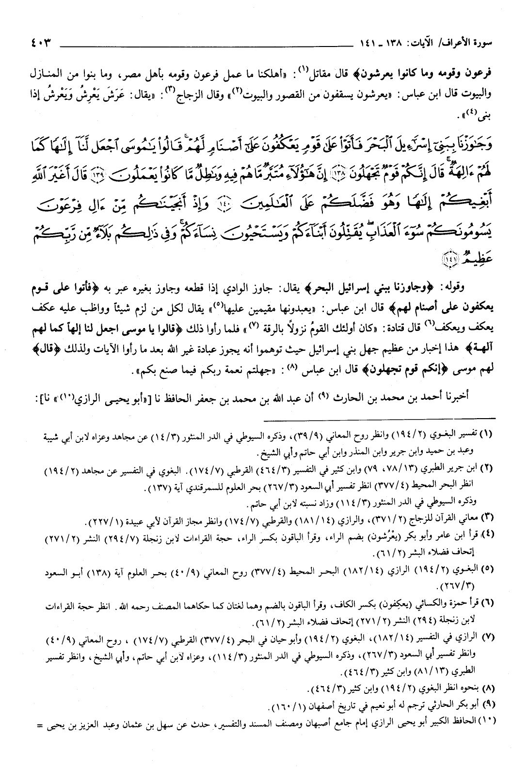 {وَجَاوَزْنَا بِبَنِي إِسْرَائِيلَ الْبَحْرَ فَأَتَوْا عَلَى قَوْمٍ يَعْكُفُونَ عَلَى أَصْنَامٍ لَهُمْ قَالُوا يَا مُوسَى اجْعَلْ لَنَا إِلَهًا كَمَا لَهُمْ آلِهَةٌ قَالَ إِنَّكُمْ قَوْمٌ تَجْهَلُونَ {138} إِنَّ هَؤُلاءِ مُتَبَّرٌ مَا هُمْ فِيهِ وَبَاطِلٌ مَا كَانُوا يَعْمَلُونَ {139} قَالَ أَغَيْرَ اللَّهِ أَبْغِيكُمْ إِلَهًا وَهُوَ فَضَّلَكُمْ عَلَى الْعَالَمِينَ {140} وَإِذْ أَنْجَيْنَاكُمْ مِنْ آلِ فِرْعَوْنَ يَسُومُونَكُمْ سُوءَ الْعَذَابِ يُقَتِّلُونَ أَبْنَاءَكُمْ وَيَسْتَحْيُونَ نِسَاءَكُمْ وَفِي ذَلِكُمْ بَلاءٌ مِنْ رَبِّكُمْ عَظِيمٌ {141} } [الأعراف: 138-141] وقوله: {وَجَاوَزْنَا بِبَنِي إِسْرَائِيلَ الْبَحْرَ} [الأعراف: 138] يقال: جاوز الوادي إذا قطعه وجاوز بغيره عبر به، {فَأَتَوْا عَلَى قَوْمٍ يَعْكُفُونَ عَلَى أَصْنَامٍ لَهُمْ} [الأعراف: 138] قال ابن عباس: يعبدونها مقيمين عليها، يقال لكل من لزم شيئا وواظب عليه: عكف يعكِف ويعكُف.