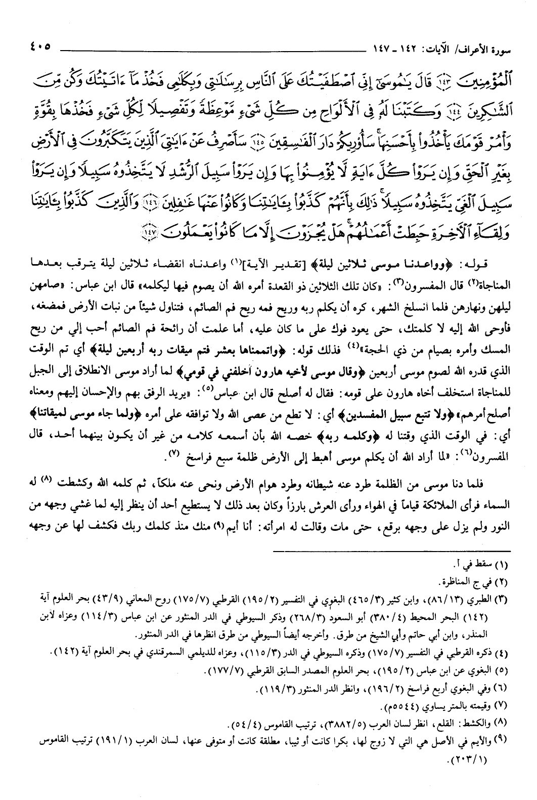 الْمُؤْمِنِينَ {143} قَالَ يَا مُوسَى إِنِّي اصْطَفَيْتُكَ عَلَى النَّاسِ بِرِسَالاتِي وَبِكَلامِي فَخُذْ مَا آتَيْتُكَ وَكُنْ مِنَ الشَّاكِرِينَ {144} وَكَتَبْنَا لَهُ فِي الأَلْوَاحِ مِنْ كُلِّ شَيْءٍ مَوْعِظَةً وَتَفْصِيلا لِكُلِّ شَيْءٍ فَخُذْهَا بِقُوَّةٍ وَأْمُرْ قَوْمَكَ يَأْخُذُوا بِأَحْسَنِهَا سَأُرِيكُمْ دَارَ الْفَاسِقِينَ {145} سَأَصْرِفُ عَنْ آيَاتِيَ الَّذِينَ يَتَكَبَّرُونَ فِي الأَرْضِ بِغَيْرِ الْحَقِّ وَإِنْ يَرَوْا كُلَّ آيَةٍ لا يُؤْمِنُوا بِهَا وَإِنْ يَرَوْا سَبِيلَ الرُّشْدِ لا يَتَّخِذُوهُ سَبِيلا وَإِنْ يَرَوْا سَبِيلَ الْغَيِّ يَتَّخِذُوهُ سَبِيلا ذَلِكَ بِأَنَّهُمْ كَذَّبُوا بِآيَاتِنَا وَكَانُوا عَنْهَا غَافِلِينَ {146} وَالَّذِينَ كَذَّبُوا بِآيَاتِنَا وَلِقَاءِ الآخِرَةِ حَبِطَتْ أَعْمَالُهُمْ هَلْ يُجْزَوْنَ إِلا مَا كَانُوا يَعْمَلُونَ {147} } [سورة الأعراف: 142-147] قوله: {وَوَاعَدْنَا مُوسَى ثَلاثِينَ لَيْلَةً} [الأعراف: 142] تقدير الآية: واعدناه انقضاء ثلاثين ليلة يترقب بعدها المناجاة، قال المفسرون: كان تلك الثلاثين ذو القعدة أمره الله أن يصوم فيها ليكلمه.