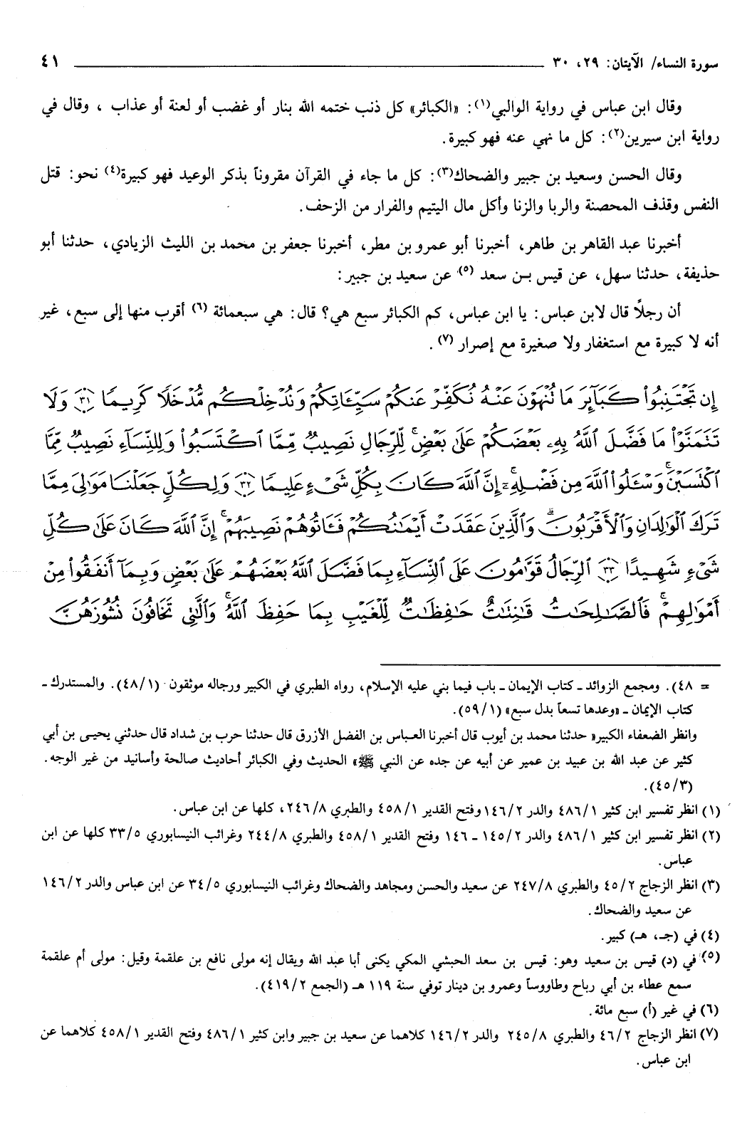 {إِنْ تَجْتَنِبُوا كَبَائِرَ مَا تُنْهَوْنَ عَنْهُ نُكَفِّرْ عَنْكُمْ سَيِّئَاتِكُمْ وَنُدْخِلْكُمْ مُدْخَلا كَرِيمًا {31} وَلا تَتَمَنَّوْا مَا فَضَّلَ اللَّهُ بِهِ بَعْضَكُمْ عَلَى بَعْضٍ لِلرِّجَالِ نَصِيبٌ مِمَّا اكْتَسَبُوا وَلِلنِّسَاءِ نَصِيبٌ مِمَّا اكْتَسَبْنَ وَاسْأَلُوا اللَّهَ مِنْ فَضْلِهِ إِنَّ اللَّهَ كَانَ بِكُلِّ شَيْءٍ عَلِيمًا {32} وَلِكُلٍّ جَعَلْنَا مَوَالِيَ مِمَّا تَرَكَ الْوَالِدَانِ وَالأَقْرَبُونَ وَالَّذِينَ عَقَدَتْ أَيْمَانُكُمْ فَآتُوهُمْ نَصِيبَهُمْ إِنَّ اللَّهَ كَانَ عَلَى كُلِّ شَيْءٍ شَهِيدًا {33} الرِّجَالُ قَوَّامُونَ عَلَى النِّسَاءِ بِمَا فَضَّلَ اللَّهُ بَعْضَهُمْ عَلَى بَعْضٍ وَبِمَا أَنْفَقُوا مِنْ أَمْوَالِهِمْ فَالصَّالِحَاتُ قَانِتَاتٌ حَافِظَاتٌ لِلْغَيْبِ بِمَا حَفِظَ اللَّهُ وَاللَّاتِي تَخَافُونَ نُشُوزَهُنَّ