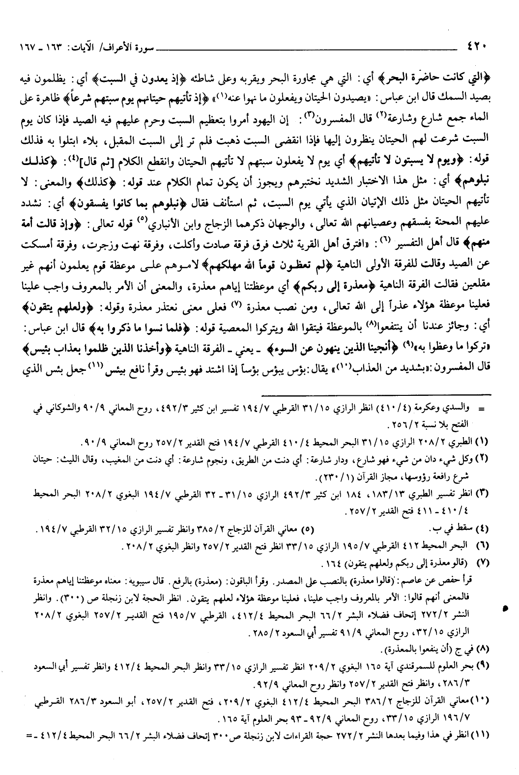 الَّتِي كَانَتْ حَاضِرَةَ الْبَحْرِ} [سورة الأعراف: 163] أي: التي هي مجاورة البحر وبقربه وعلى شاطئه، {إِذْ يَعْدُونَ فِي السَّبْتِ} [الأعراف: 163] أي: يظلمون فيه بصيد السمك، قال ابن عباس: يصيدون الحيتان ويفعلون ما نهوا عنه.