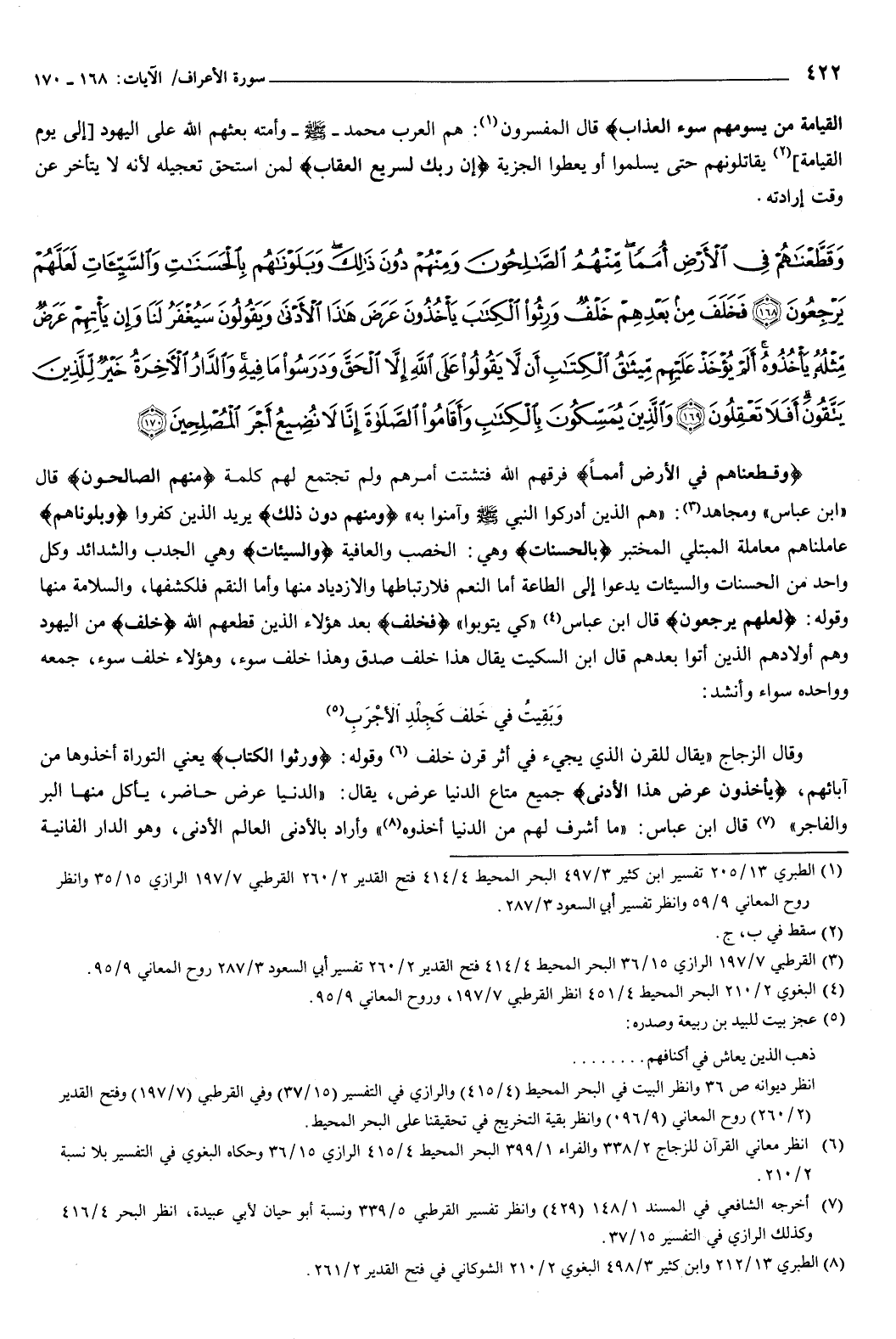 {وَقَطَّعْنَاهُمْ فِي الأَرْضِ أُمَمًا مِنْهُمُ الصَّالِحُونَ وَمِنْهُمْ دُونَ ذَلِكَ وَبَلَوْنَاهُمْ بِالْحَسَنَاتِ وَالسَّيِّئَاتِ لَعَلَّهُمْ يَرْجِعُونَ {168} فَخَلَفَ مِنْ بَعْدِهِمْ خَلْفٌ وَرِثُوا الْكِتَابَ يَأْخُذُونَ عَرَضَ هَذَا الأَدْنَى وَيَقُولُونَ سَيُغْفَرُ لَنَا وَإِنْ يَأْتِهِمْ عَرَضٌ مِثْلُهُ يَأْخُذُوهُ أَلَمْ يُؤْخَذْ عَلَيْهِمْ مِيثَاقُ الْكِتَابِ أَنْ لا يَقُولُوا عَلَى اللَّهِ إِلا الْحَقَّ وَدَرَسُوا مَا فِيهِ وَالدَّارُ الآخِرَةُ خَيْرٌ لِلَّذِينَ يَتَّقُونَ أَفَلا تَعْقِلُونَ {169} وَالَّذِينَ يُمَسِّكُونَ بِالْكِتَابِ وَأَقَامُوا الصَّلاةَ إِنَّا لا نُضِيعُ أَجْرَ الْمُصْلِحِينَ {170} } [الأعراف: 168-170] {وَقَطَّعْنَاهُمْ فِي الأَرْضِ أُمَمًا} [الأعراف: 168] فرقهم الله فتشتت أمرهم ولم تجتمع لهم كلمة، منهم الصالحون قال ابن عباس، ومجاهد: هم الذين أدركوا النبي صَلَّى اللهُ عَلَيْهِ وَسَلَّمَ وآمنوا به، {وَمِنْهُمْ دُونَ ذَلِكَ} [الأعراف: 168] يريد: الذين كفروا، وبلوناهم عاملناهم معاملة المبتلي المختبر، بالحسنات وهي: الخصب والعافية، والسيئات وهي الجدب والشدائد، وكل واحد من الحسنات والسيئات يدعو إلى الطاعة: أما النعم فلارتباطها والازدياد منها، وأما النقم فلكشفها، والسلامة منها، وقوله: لعلهم يرجعون قال ابن عباس: كي يتوبوا.