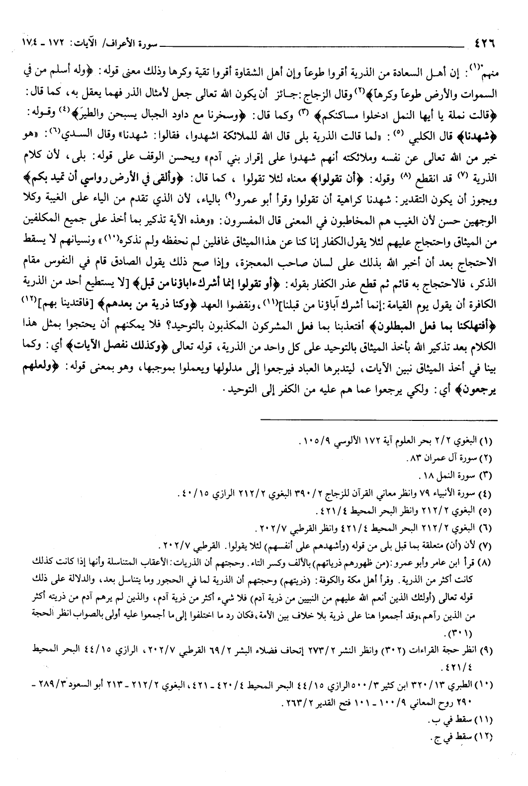 منهم: إن أهل السعادة من الذرية أقروا طوعا، وإن أهل الشقاوة أقروا تقية وكرها، وذلك معنى قوله: {وَلَهُ أَسْلَمَ مَنْ فِي السَّمَوَاتِ وَالأَرْضِ طَوْعًا وَكَرْهًا} [آل عمران: 83] وقال الزجاج: جائز أن يكون الله تعالى جعل لأمثال الذر فهما يعقل به، كما قال: {قَالَتْ نَمْلَةٌ يَأَيُّهَا النَّمْلُ ادْخُلُوا مَسَاكِنَكُمْ} [النمل: 18] ، وكما قال: {وَسَخَّرْنَا مَعَ دَاوُدَ الْجِبَالَ يُسَبِّحْنَ وَالطَّيْرَ} [الأنبياء: 79] .