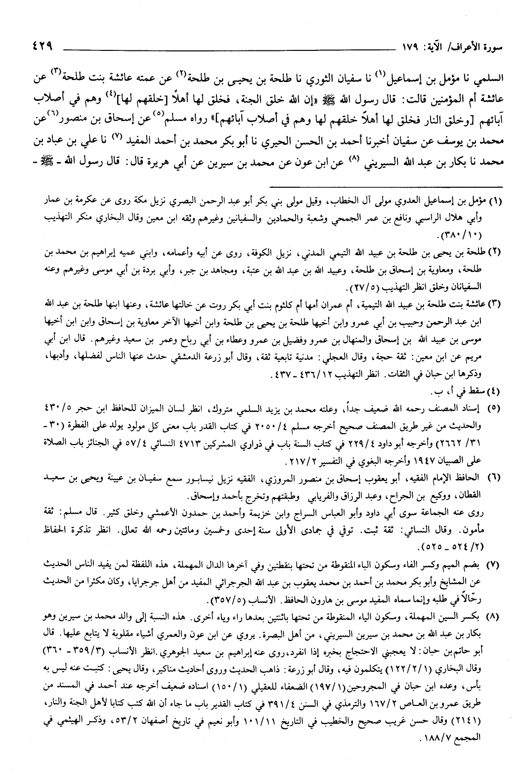 السُّلَمِيُّ، نا مُؤَمَّلُ بْنُ إِسْمَاعِيلَ، نا سُفْيَانُ الثَّوْرِيُّ، نا طَلْحَةُ بْنُ يَحْيَى بْنِ طَلْحَةَ، عَنْ عَمَّتِهِ عَائِشَةَ بِنْتِ طَلْحَةَ، عَنْ عَائِشَةَ أُمِّ الْمُؤْمِنِينَ، قَالَتْ: قَالَ رَسُولُ اللَّهِ صَلَّى اللهُ عَلَيْهِ وَسَلَّمَ: «إِنَّ اللَّهَ خَلَقَ الْجَنَّةَ فَخَلَقَ لَهَا أَهْلا خَلَقَهُمْ لَهَا وَهُمْ فِي أَصْلَابِ آبَائِهِمْ، وَخَلَقَ النَّارَ فَخَلَقَ لَهَا أَهْلا خَلَقَهُمْ لَهَا وَهُمْ فِي أَصْلَابِ آبَائِهِمْ» .