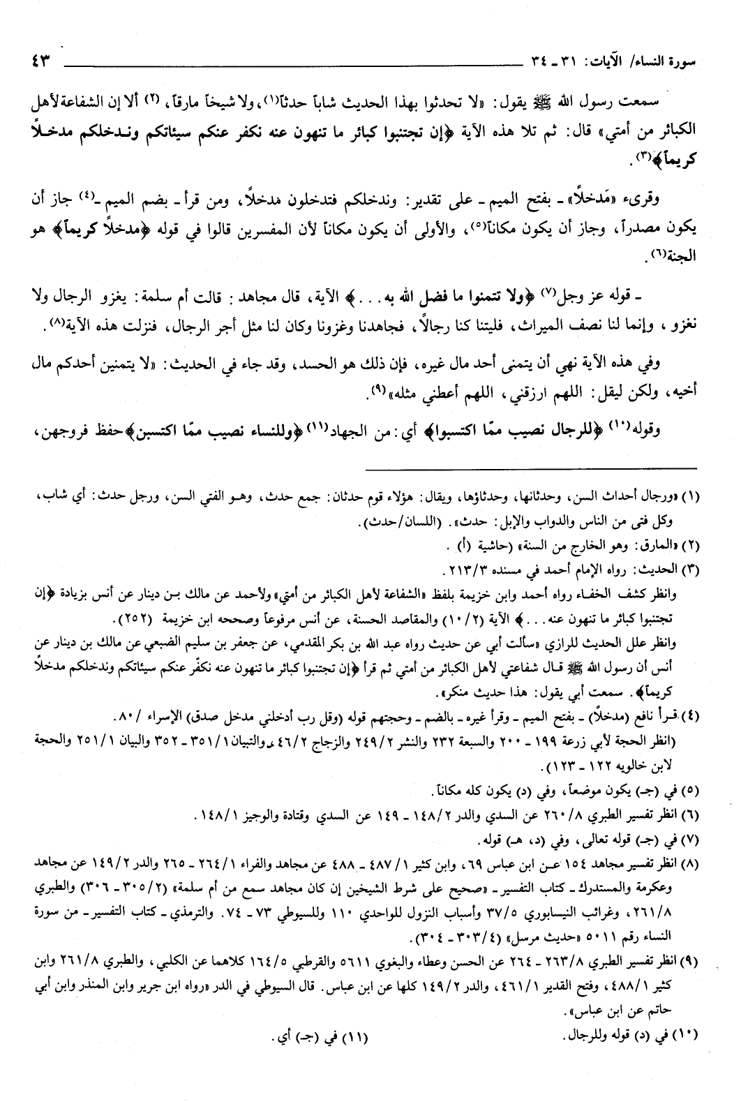 قوله عَزَّ وَجَلّ: {وَلا تَتَمَنَّوْا مَا فَضَّلَ اللَّهُ بِهِ} [النساء: 32] الآية، قَالَ مُجَاهِد: قَالَتْ أم سَلَمَة: يغزو الرجال وَلَا نغزو، وإنما لنا نصف الميراث، فليتنا كُنَّا رجالا، فجاهدنا وغزونا وكان لنا مثل أجر الرجال، فنزلت هَذِهِ الآية.