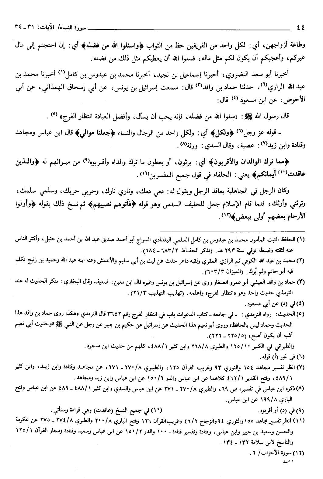 {مِمَّا تَرَكَ الْوَالِدَانِ وَالأَقْرَبُونَ} [النساء: 33] أَيّ: يرثون، أَوْ يعطون ما ترك والداه وأقربوه من ميراثهم لَهُ، والذين عاقدت أيمانكم يعني: الحلفاء فِي قول جميع المفسرين.
