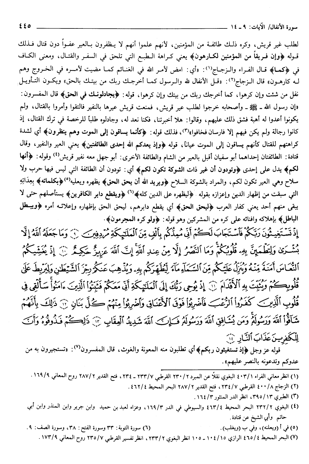 {إِذْ تَسْتَغِيثُونَ رَبَّكُمْ فَاسْتَجَابَ لَكُمْ أَنِّي مُمِدُّكُمْ بِأَلْفٍ مِنَ الْمَلائِكَةِ مُرْدِفِينَ {9} وَمَا جَعَلَهُ اللَّهُ إِلا بُشْرَى وَلِتَطْمَئِنَّ بِهِ قُلُوبُكُمْ وَمَا النَّصْرُ إِلا مِنْ عِنْدِ اللَّهِ إِنَّ اللَّهَ عَزِيزٌ حَكِيمٌ {10} إِذْ يُغَشِّيكُمُ النُّعَاسَ أَمَنَةً مِنْهُ وَيُنَزِّلُ عَلَيْكُمْ مِنَ السَّمَاءِ مَاءً لِيُطَهِّرَكُمْ بِهِ وَيُذْهِبَ عَنْكُمْ رِجْزَ الشَّيْطَانِ وَلِيَرْبِطَ عَلَى قُلُوبِكُمْ وَيُثَبِّتَ بِهِ الأَقْدَامَ {11} إِذْ يُوحِي رَبُّكَ إِلَى الْمَلائِكَةِ أَنِّي مَعَكُمْ فَثَبِّتُوا الَّذِينَ آمَنُوا سَأُلْقِي فِي قُلُوبِ الَّذِينَ كَفَرُوا الرُّعْبَ فَاضْرِبُوا فَوْقَ الأَعْنَاقِ وَاضْرِبُوا مِنْهُمْ كُلَّ بَنَانٍ {12} ذَلِكَ بِأَنَّهُمْ شَاقُّوا اللَّهَ وَرَسُولَهُ وَمَنْ يُشَاقِقِ اللَّهَ وَرَسُولَهُ فَإِنَّ اللَّهَ شَدِيدُ الْعِقَابِ {13} ذَلِكُمْ فَذُوقُوهُ وَأَنَّ لِلْكَافِرِينَ عَذَابَ النَّارِ {14} } [الأنفال: 9-14] قوله عز وجل: {إِذْ تَسْتَغِيثُونَ رَبَّكُمْ} [الأنفال: 9] أي: تطلبون منه المعونة والغوث، قال المفسرون: تستجيرون به من عدوكم وتدعونه بالنصر عليهم.