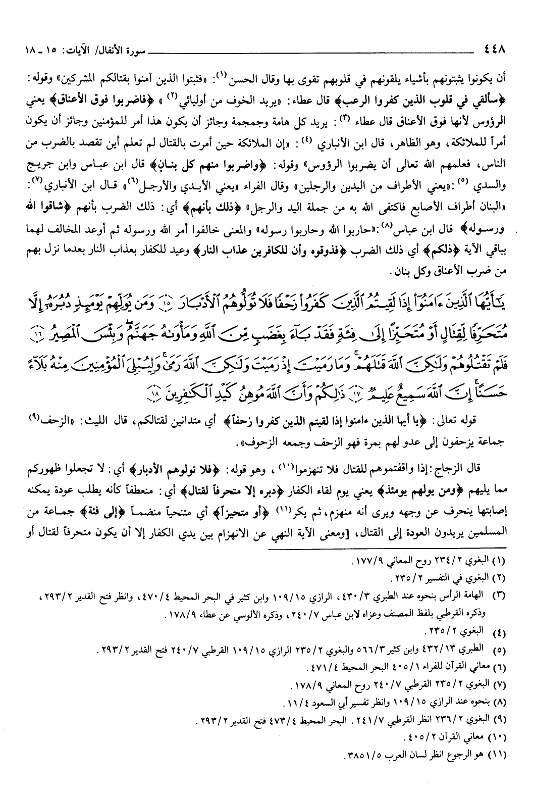{يَأَيُّهَا الَّذِينَ آمَنُوا إِذَا لَقِيتُمُ الَّذِينَ كَفَرُوا زَحْفًا فَلا تُوَلُّوهُمُ الأَدْبَارَ {15} وَمَنْ يُوَلِّهِمْ يَوْمَئِذٍ دُبُرَهُ إِلا مُتَحَرِّفًا لِقِتَالٍ أَوْ مُتَحَيِّزًا إِلَى فِئَةٍ فَقَدْ بَاءَ بِغَضَبٍ مِنَ اللَّهِ وَمَأْوَاهُ جَهَنَّمُ وَبِئْسَ الْمَصِيرُ {16} فَلَمْ تَقْتُلُوهُمْ وَلَكِنَّ اللَّهَ قَتَلَهُمْ وَمَا رَمَيْتَ إِذْ رَمَيْتَ وَلَكِنَّ اللَّهَ رَمَى وَلِيُبْلِيَ الْمُؤْمِنِينَ مِنْهُ بَلاءً حَسَنًا إِنَّ اللَّهَ سَمِيعٌ عَلِيمٌ {17} ذَلِكُمْ وَأَنَّ اللَّهَ مُوهِنُ كَيْدِ الْكَافِرِينَ {18} } [الأنفال: 15-18] قوله تعالى: {يَأَيُّهَا الَّذِينَ آمَنُوا إِذَا لَقِيتُمُ الَّذِينَ كَفَرُوا زَحْفًا} [الأنفال: 15] أي متدانين لقتالكم، قال الليث: الزحف: جماعة يزحفون إلى عدو لهم بمرة فهو الزحف وجمعه الزحوف.