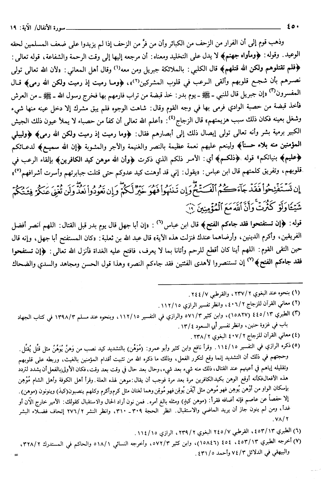 {إِنْ تَسْتَفْتِحُوا فَقَدْ جَاءَكُمُ الْفَتْحُ وَإِنْ تَنْتَهُوا فَهُوَ خَيْرٌ لَكُمْ وَإِنْ تَعُودُوا نَعُدْ وَلَنْ تُغْنِيَ عَنْكُمْ فِئَتُكُمْ شَيْئًا وَلَوْ كَثُرَتْ وَأَنَّ اللَّهَ مَعَ الْمُؤْمِنِينَ} [الأنفال: 19] قوله: {إِنْ تَسْتَفْتِحُوا فَقَدْ جَاءَكُمُ الْفَتْحُ} [الأنفال: 19] قال ابن عباس: إن أبا جهل قال يوم بدر قبل القتال: اللهم انصر أفضل الفريقين وأكرم الدينين، وأرضاهما عندك فنزلت هذه الآية.