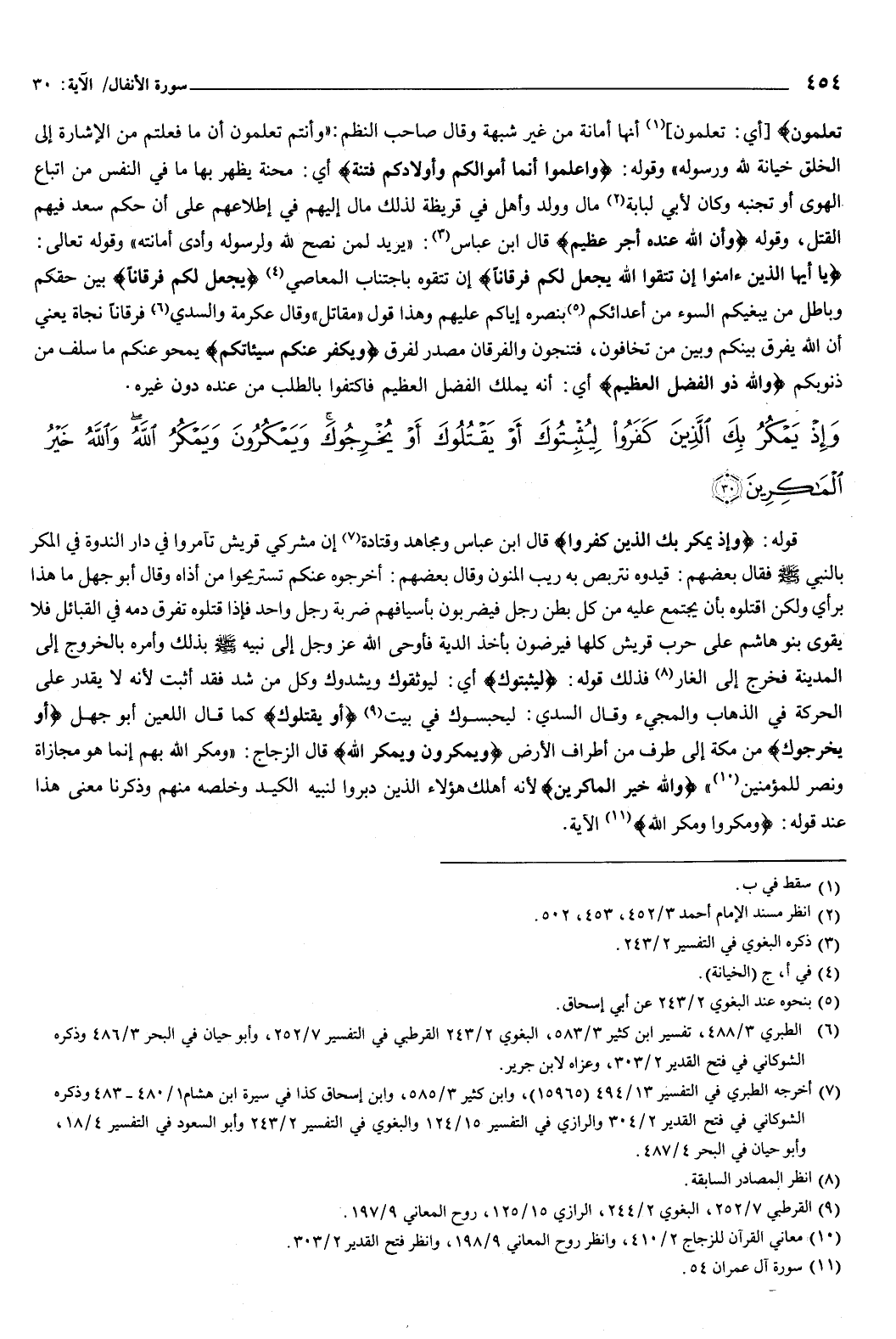 {وَإِذْ يَمْكُرُ بِكَ الَّذِينَ كَفَرُوا لِيُثْبِتُوكَ أَوْ يَقْتُلُوكَ أَوْ يُخْرِجُوكَ وَيَمْكُرُونَ وَيَمْكُرُ اللَّهُ وَاللَّهُ خَيْرُ الْمَاكِرِينَ} [الأنفال: 30] قوله: {وَإِذْ يَمْكُرُ بِكَ الَّذِينَ كَفَرُوا} [الأنفال: 30] قال ابن عباس، ومجاهد، وقتادة: إن مشركي قريش تآمروا في دار الندوة في المكر بالنبي صَلَّى اللهُ عَلَيْهِ وَسَلَّمَ، فقال بعضهم: قيدوه نتربص به ريب المنون.