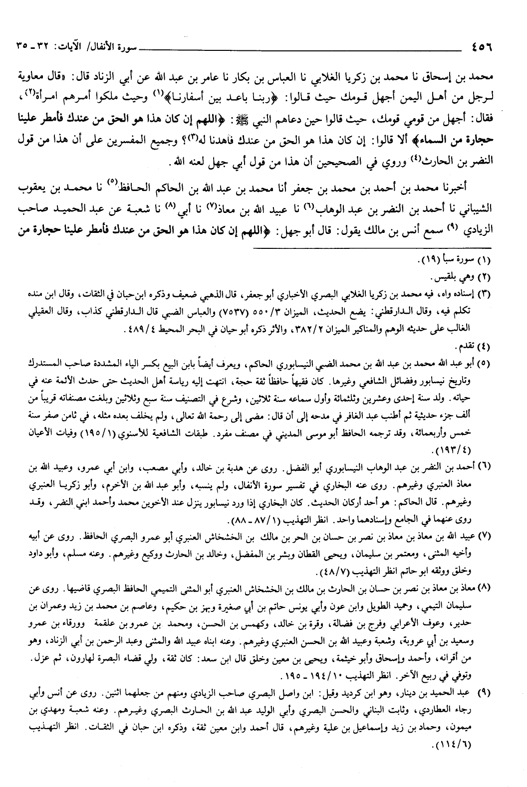 محمد بن إسحاق، نا محمد بن زكريا الغلابي، نا العباس بن بكار، نا عامر بن عبد الله، عن أبي الزناد، قال: قال معاوية لرجل من أهل اليمن: أجهل قومك حيث قالوا: {رَبَّنَا بَاعِدْ بَيْنَ أَسْفَارِنَا} [سبأ: 19] ، وحيث ملكوا أمرهم امرأة؟ ! فقال: أجهل من قومي قومك، حيث قالوا حين دعاهم النبي صَلَّى اللهُ عَلَيْهِ وَسَلَّمَ: {اللَّهُمَّ إِنْ كَانَ هَذَا هُوَ الْحَقَّ مِنْ عِنْدِكَ فَأَمْطِرْ عَلَيْنَا حِجَارَةً مِنَ