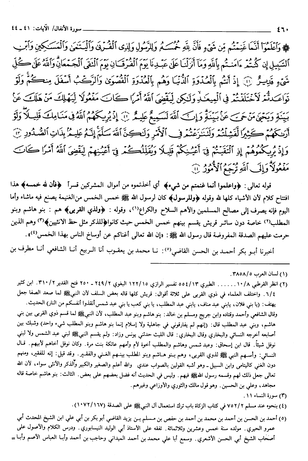 وَاعْلَمُوا أَنَّمَا غَنِمْتُمْ مِنْ شَيْءٍ فَأَنَّ لِلَّهِ خُمُسَهُ وَلِلرَّسُولِ وَلِذِي الْقُرْبَى وَالْيَتَامَى وَالْمَسَاكِينِ وَابْنِ السَّبِيلِ إِنْ كُنْتُمْ آمَنْتُمْ بِاللَّهِ وَمَا أَنْزَلْنَا عَلَى عَبْدِنَا يَوْمَ الْفُرْقَانِ يَوْمَ الْتَقَى الْجَمْعَانِ وَاللَّهُ عَلَى كُلِّ شَيْءٍ قَدِيرٌ {41} إِذْ أَنْتُمْ بِالْعُدْوَةِ الدُّنْيَا وَهُمْ بِالْعُدْوَةِ الْقُصْوَى وَالرَّكْبُ أَسْفَلَ مِنْكُمْ وَلَوْ تَوَاعَدْتُمْ لاخْتَلَفْتُمْ فِي الْمِيعَادِ وَلَكِنْ لِيَقْضِيَ اللَّهُ أَمْرًا كَانَ مَفْعُولا لِيَهْلِكَ مَنْ هَلَكَ عَنْ بَيِّنَةٍ وَيَحْيَى مَنْ حَيَّ عَنْ بَيِّنَةٍ وَإِنَّ اللَّهَ لَسَمِيعٌ عَلِيمٌ {42} إِذْ يُرِيكَهُمُ اللَّهُ فِي مَنَامِكَ قَلِيلا وَلَوْ أَرَاكَهُمْ كَثِيرًا لَفَشِلْتُمْ وَلَتَنَازَعْتُمْ فِي الأَمْرِ وَلَكِنَّ اللَّهَ سَلَّمَ إِنَّهُ عَلِيمٌ بِذَاتِ الصُّدُورِ {43} وَإِذْ يُرِيكُمُوهُمْ إِذِ الْتَقَيْتُمْ فِي أَعْيُنِكُمْ قَلِيلا وَيُقَلِّلُكُمْ فِي أَعْيُنِهِمْ لِيَقْضِيَ اللَّهُ أَمْرًا كَانَ مَفْعُولا وَإِلَى اللَّهِ تُرْجَعُ الأُمُورُ {44} } [الأنفال: 41-44] قوله تعالى: {وَاعْلَمُوا أَنَّمَا غَنِمْتُمْ مِنْ شَيْءٍ} [الأنفال: 41] أي: أخذتموه من أموال المشركين قسرا، {فَأَنَّ لِلَّهِ خُمُسَهُ} [الأنفال: 41] هذا افتتاح كلام لأن الأشياء كلها لله، وقوله: وللرسول كان لرسول الله صَلَّى اللهُ عَلَيْهِ وَسَلَّمَ خمس الخمس من الغنيمة يصنع فيها ما شاء، وأما اليوم فإنه يصرف إلى مصالح المسلمين والأهم السلاح والكراع، وقوله: ولذي القربى هم: بنو هاشم وبنو المطلب خاصة دون سائر قريش، يقسم بينهم خمس الخمس حيث كانوا: {لِلذَّكَرِ مِثْلُ حَظِّ الأُنْثَيَيْنِ} [النساء: 11] ، وهم الذين حرمت عليهم الصدقة المفروضة، قال رسول الله صَلَّى اللهُ عَلَيْهِ وَسَلَّمَ: «إن الله تعالى أغناكم عن أوساخ الناس بهذا الخمس» .