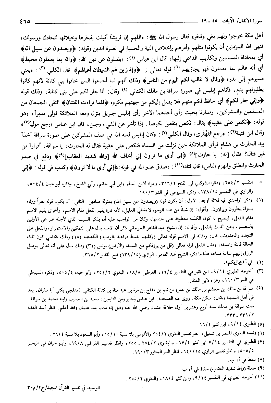 قوله تعالى: {وَإِذْ زَيَّنَ لَهُمُ الشَّيْطَانُ أَعْمَالَهُمْ} [الأنفال: 48] قال الكلبي: يعني مسيرهم إلى بدر، {وَقَالَ لا غَالِبَ لَكُمُ الْيَوْمَ مِنَ النَّاسِ} [الأنفال: 48] وذلك أنهم لما أجمعوا السير خافوا بني كنانة لأنهم كانوا يطلبونهم بدم، فأتاهم إبليس في صورة سراقة بن مالك الكناني، وقال: أنا جار لكم على بني كنانة، وذلك قوله: {وَإِنِّي جَارٌ لَكُمْ} [الأنفال: 48] أي: حافظ لكم منهم فلا يصل إليكم من جهتهم مكروه، {فَلَمَّا تَرَاءَتِ الْفِئَتَانِ} [الأنفال: 48] التقى الجمعان من المسلمين والمشركين، وصارتا بحيث رأى أحدهما الآخر، رأى إبليس جبريل ينزل ومعه الملائكة، فولى مدبرا، وهو قوله: {نَكَصَ عَلَى عَقِبَيْهِ} [الأنفال: 48] يقال: نكص ينكص نكوصا.