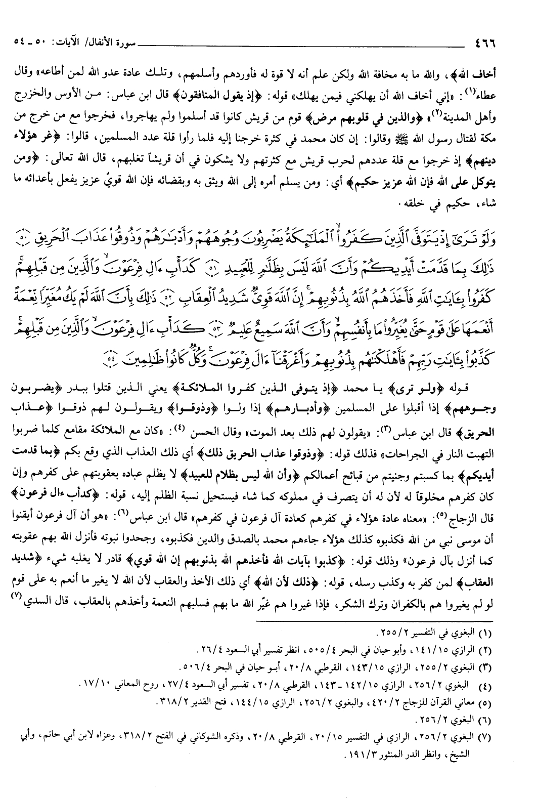 {وَلَوْ تَرَى إِذْ يَتَوَفَّى الَّذِينَ كَفَرُوا الْمَلائِكَةُ يَضْرِبُونَ وُجُوهَهُمْ وَأَدْبَارَهُمْ وَذُوقُوا عَذَابَ الْحَرِيقِ {50} ذَلِكَ بِمَا قَدَّمَتْ أَيْدِيكُمْ وَأَنَّ اللَّهَ لَيْسَ بِظَلامٍ لِلْعَبِيدِ {51} كَدَأْبِ آلِ فِرْعَوْنَ وَالَّذِينَ مِنْ قَبْلِهِمْ كَفَرُوا بِآيَاتِ اللَّهِ فَأَخَذَهُمُ اللَّهُ بِذُنُوبِهِمْ إِنَّ اللَّهَ قَوِيٌّ شَدِيدُ الْعِقَابِ {52} ذَلِكَ بِأَنَّ اللَّهَ لَمْ يَكُ مُغَيِّرًا نِعْمَةً أَنْعَمَهَا عَلَى قَوْمٍ حَتَّى يُغَيِّرُوا مَا بِأَنْفُسِهِمْ وَأَنَّ اللَّهَ سَمِيعٌ عَلِيمٌ {53} كَدَأْبِ آلِ فِرْعَوْنَ وَالَّذِينَ مِنْ قَبْلِهِمْ كَذَّبُوا بِآيَاتِ رَبِّهِمْ فَأَهْلَكْنَاهُمْ بِذُنُوبِهِمْ وَأَغْرَقْنَا آلَ فِرْعَوْنَ وَكُلٌّ كَانُوا ظَالِمِينَ {54} } [الأنفال: 50-54] قوله: ولو ترى يا محمد، {إِذْ يَتَوَفَّى الَّذِينَ كَفَرُوا الْمَلائِكَةُ} [الأنفال: 50] يعني الذين قتلوا ببدر، يضربون وجوههم إذا أقبلوا على المسلمين، وأدبارهم إذا ولوا، وذوقوا ويقولون لهم ذوقوا عذاب الحريق: قال ابن عباس: يقولون لهم ذلك بعد الموت.