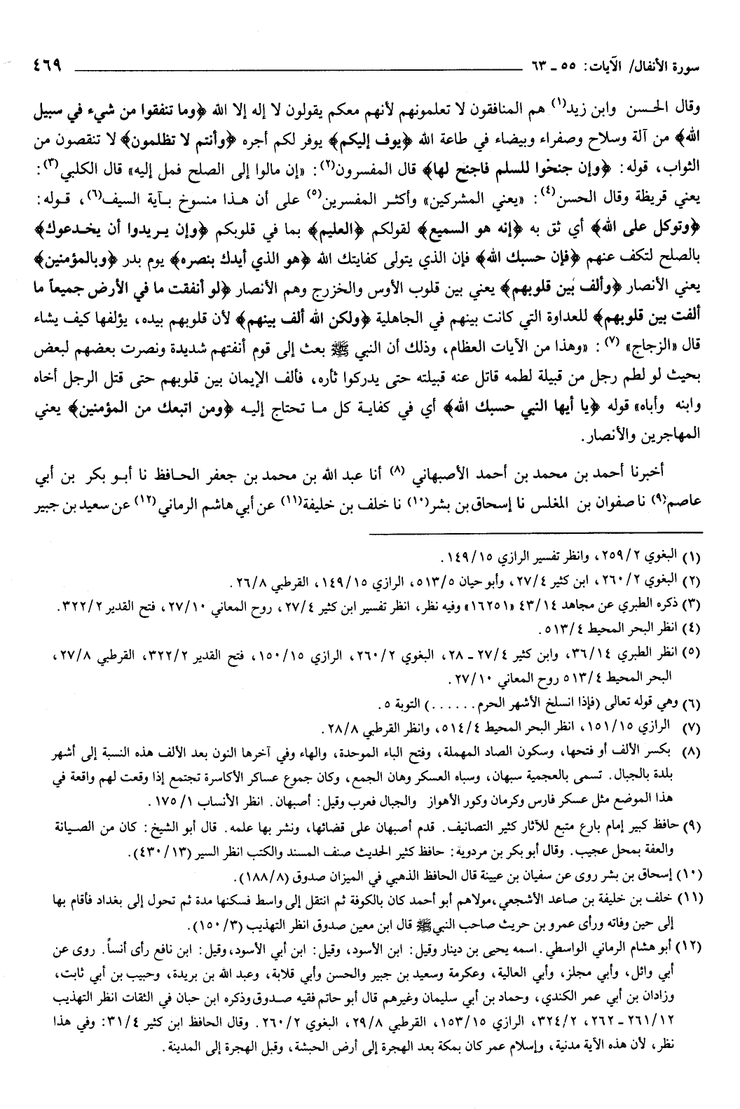 {وَإِنْ يُرِيدُوا أَنْ يَخْدَعُوكَ} [الأنفال: 62] بالصلح لتكف عنهم، {فَإِنَّ حَسْبَكَ اللَّهُ} [الأنفال: 62] فإن الذي يتولى كفايتك الله، {هُوَ الَّذِي أَيَّدَكَ بِنَصْرِهِ} [الأنفال: 62] يوم بدر، وبالمؤمنين يعني الأنصار، {وَأَلَّفَ بَيْنَ قُلُوبِهِمْ} [الأنفال: 63] يعني بين قلوب الأوس والخزرج، وهم الأنصار، {لَوْ أَنْفَقْتَ مَا فِي الأَرْضِ جَمِيعًا مَا أَلَّفْتَ بَيْنَ قُلُوبِهِمْ} [الأنفال: 63] للعداوة التي كانت بينهم في الجاهلية، {وَلَكِنَّ اللَّهَ أَلَّفَ بَيْنَهُمْ} [الأنفال: 63] لأن قلوبهم بيده يؤلفها كيف يشاء، قال الزجاج: وهذا من الآيات العظام، وذلك أن النبي صَلَّى اللهُ عَلَيْهِ وَسَلَّمَ بعث إلى قوم أنفتهم شديدة، ونصرة بعضهم لبعض بحيث لو لطم رجل من قبيلة لطمة قاتل عنه قبيلته حتى يدركوا ثأره، فألف الإيمان بين قلوبهم حتى قتل الرجل أخاه وابنه وأباه.
