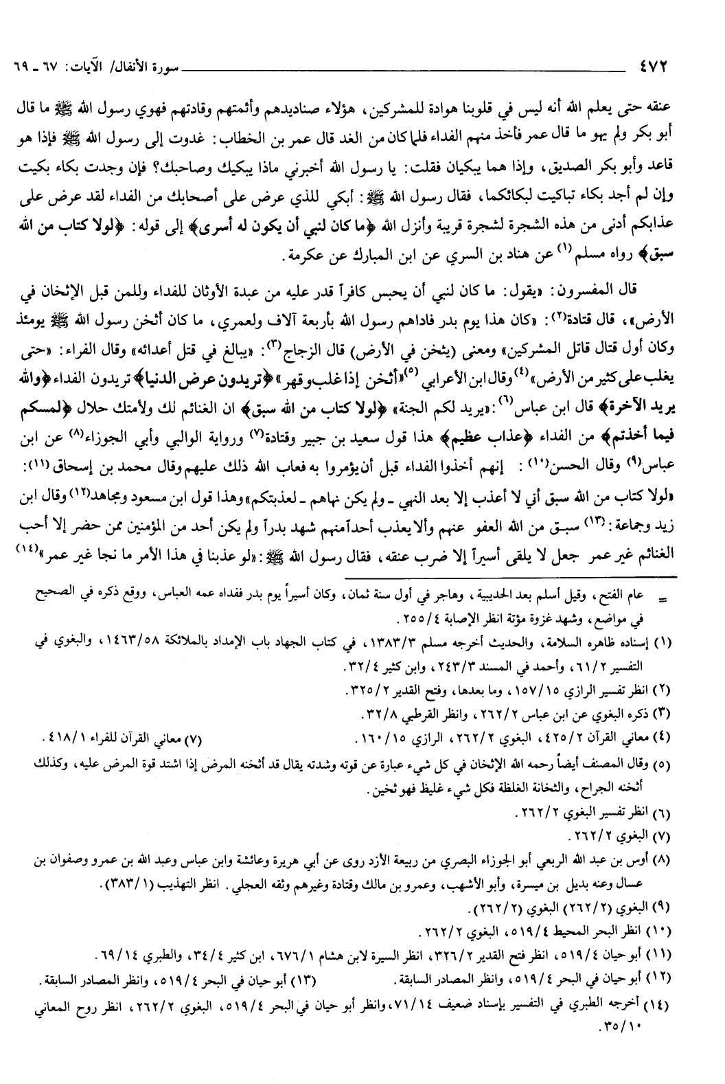 عُنُقَهُ حَتَّى يَعْلَمَ اللَّهُ أَنَّهُ لَيْسَ فِي قُلُوبِنَا هَوَادَةٌ لِلْمُشْرِكِينَ، هَؤُلاءِ صَنَادِيدُهُمْ وَأَئِمَّتُهُمْ وَقَادَتُهُمْ، فَهَوَى رَسُولُ اللَّهِ صَلَّى اللهُ عَلَيْهِ وَسَلَّمَ مَا قَالَ أَبُو بَكْرٍ وَلَمْ يَهْوَ مَا قَالَ عُمَرُ، فَأَخَذَ مِنْهُمُ الْفِدَاءَ فَلَمَّا كَانَ مِنَ الْغَدِ قَالَ عُمَرُ بْنُ الْخَطَّابِ: غَدَوْتُ إِلَى رَسُولِ اللَّهِ صَلَّى اللهُ عَلَيْهِ وَسَلَّمَ فَإِذَا هُوَ قَاعِدٌ وَأَبُو بَكْرٍ الصِّدِّيقُ، وَإِذَا هُمَا يَبْكِيَانِ فَقُلْتُ: يَا رَسُولَ اللَّهِ أَخْبِرْنِي مَاذَا يُبْكِيكَ وَصَاحِبَكَ؟ فَإِنْ وَجَدْتُ بُكَاءً بَكَيْتُ، وَإِنْ لَمْ أَجِدْ بُكَاءً تَبَاكَيْتُ لِبُكَائِكُمَا، فَقَالَ رَسُولُ اللَّهِ صَلَّى اللهُ عَلَيْهِ وَسَلَّمَ: " أَبْكِي لِلَّذِي عُرِضَ عَلَى أَصْحَابِكَ مِنَ الْفِدَاءِ لَقَدْ عُرِضَ عَلَى عَذَابِكُمْ أَدْنَى مِنْ هَذِهِ الشَّجَرَةِ لِشَجَرَةٍ قَرِيبَةٍ، وَأَنْزَلَ اللَّهُ {مَا كَانَ لِنَبِيٍّ أَنْ يَكُونَ لَهُ أَسْرَى إِلَى قَوْلِهِ لَوْلا كِتَابٌ مِنَ اللَّهِ سَبَقَ} [الأنفال: 67 - 68] .