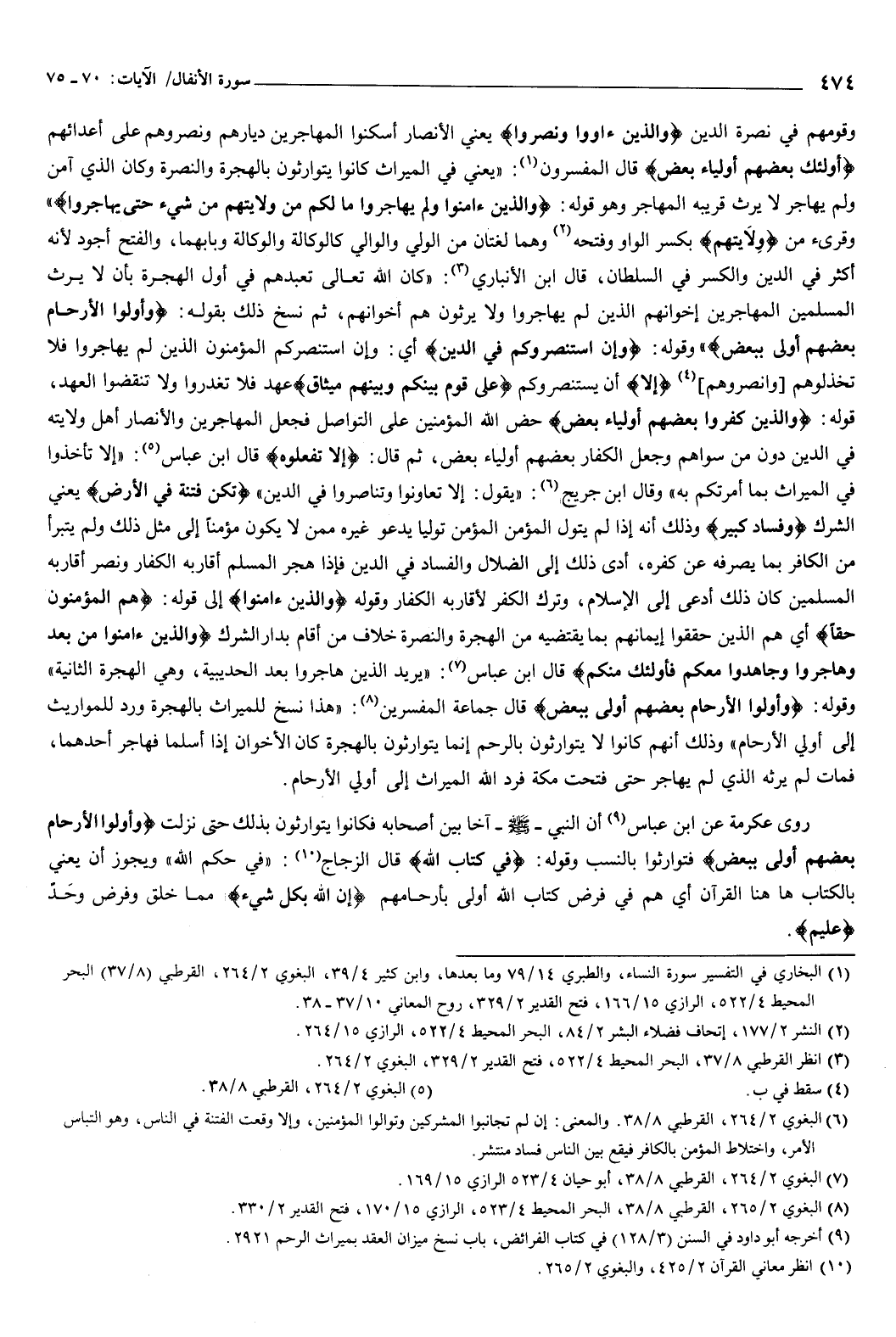 وقوله: {وَأُولُو الأَرْحَامِ بَعْضُهُمْ أَوْلَى بِبَعْضٍ} [الأنفال: 75] قال جماعة المفسرين: هذا نسخ للميراث بالهجرة، ورد للمواريث إلى أولي الأرحام، وذلك أنهم كانوا لا يتوارثون بالرحم، إنما يتوارثون بالهجرة، كان الأخوان إذا أسلما فهاجر أحدهما فمات لم يرثه الذي لم يهاجر حتى فتحت مكة فرد الله الميراث إلى أولي الأرحام.